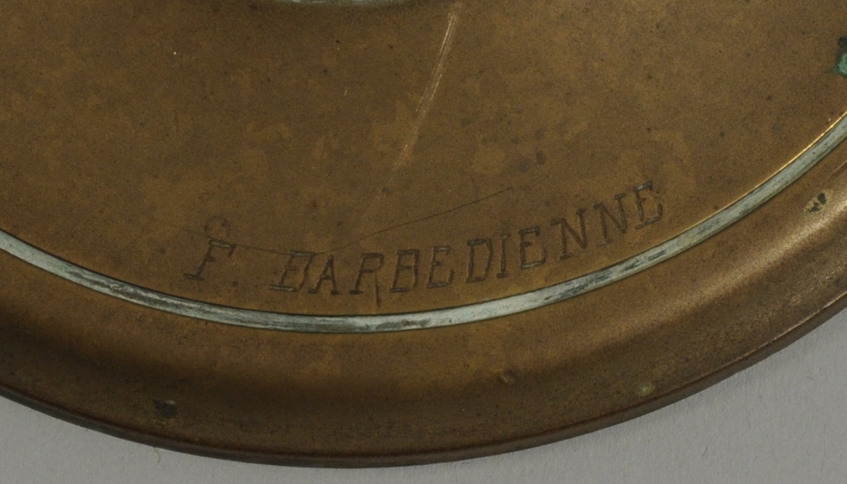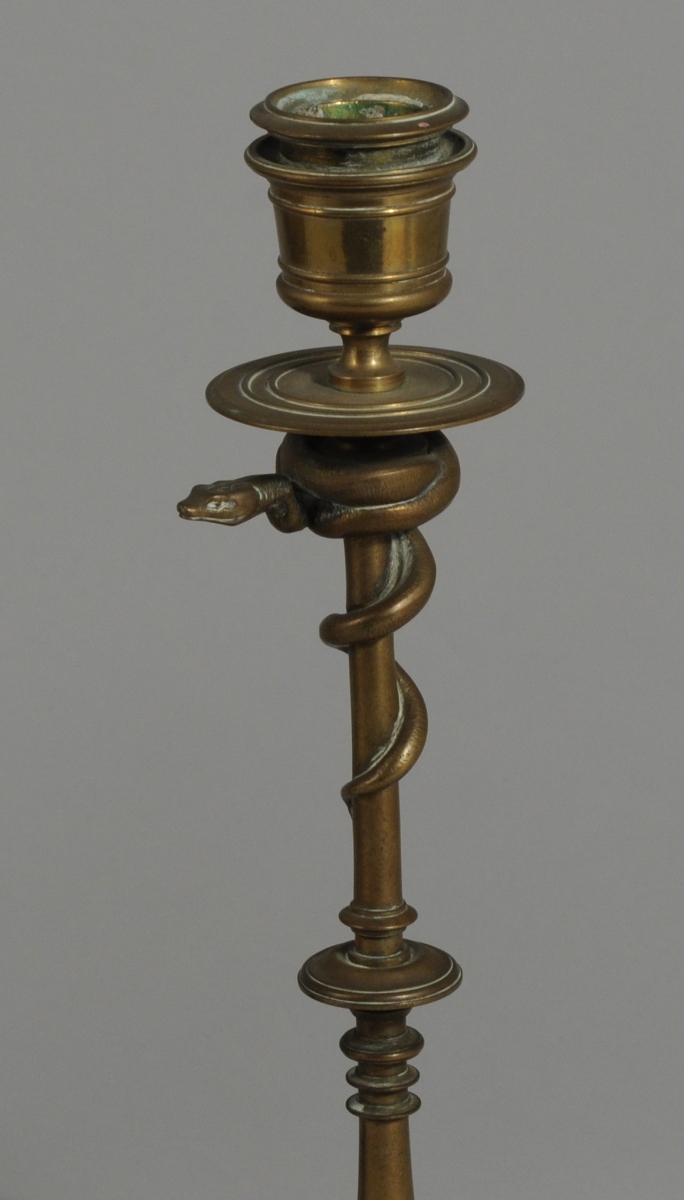 Ferdinand BARBEDIENNE (1810-1892). Réunion d'une coupe et de deux flambeaux. La coupe circulaire, reposant sur pied haut, à décor émaillé polychrome d'entrelacs et de végétaux stylisés. Les flambeaux en bronze uni, ornés sur le fût de serpents. Signés.