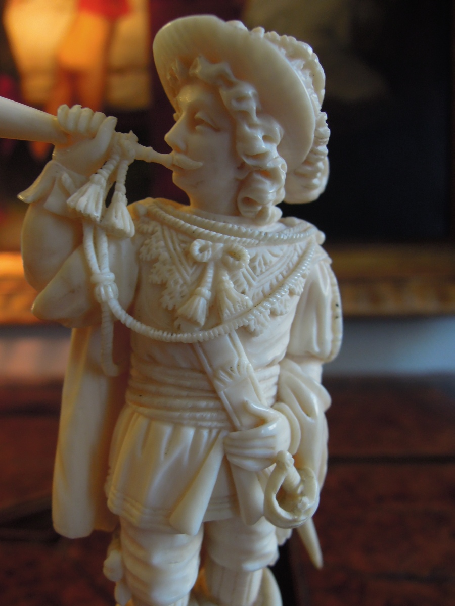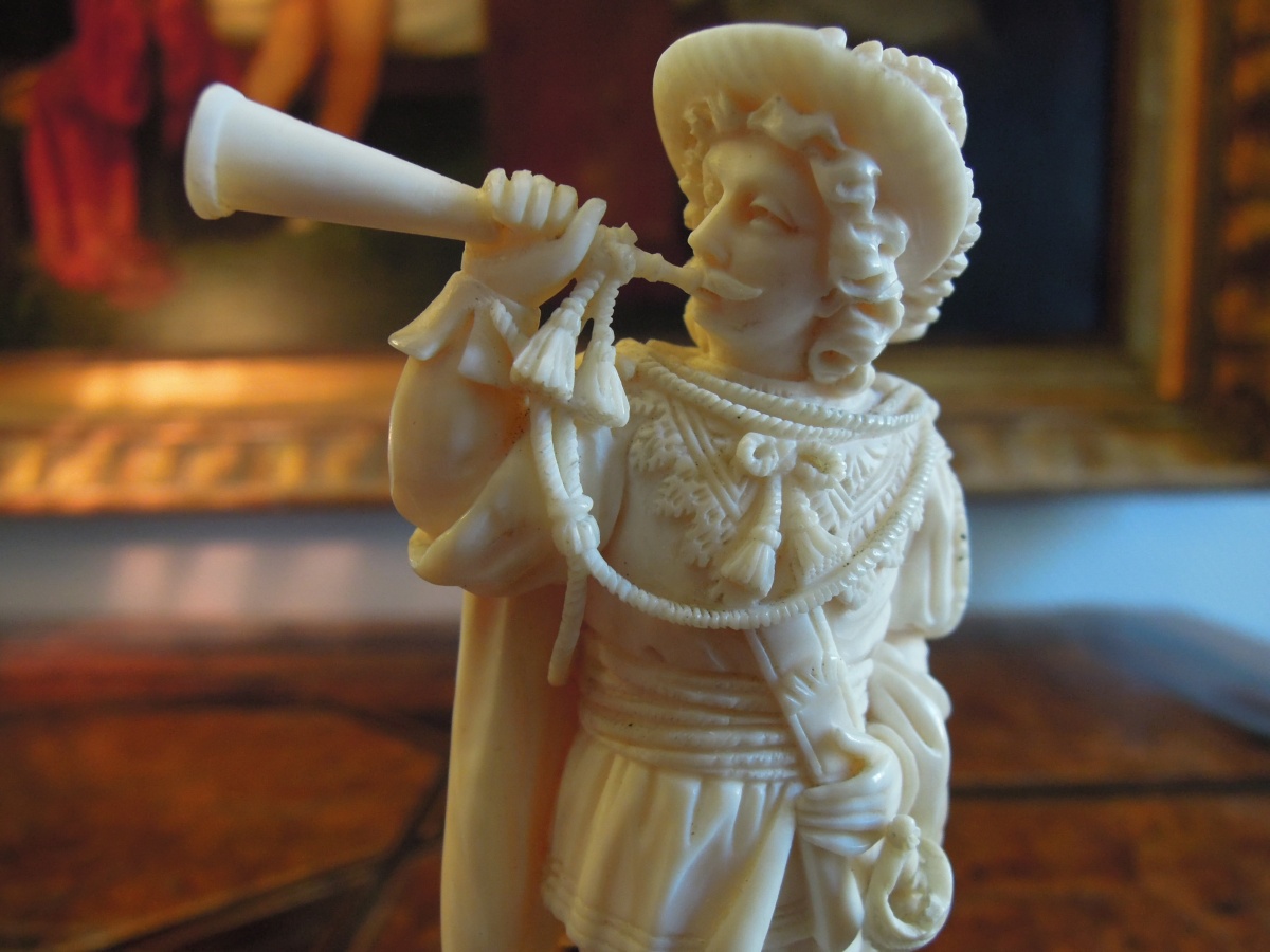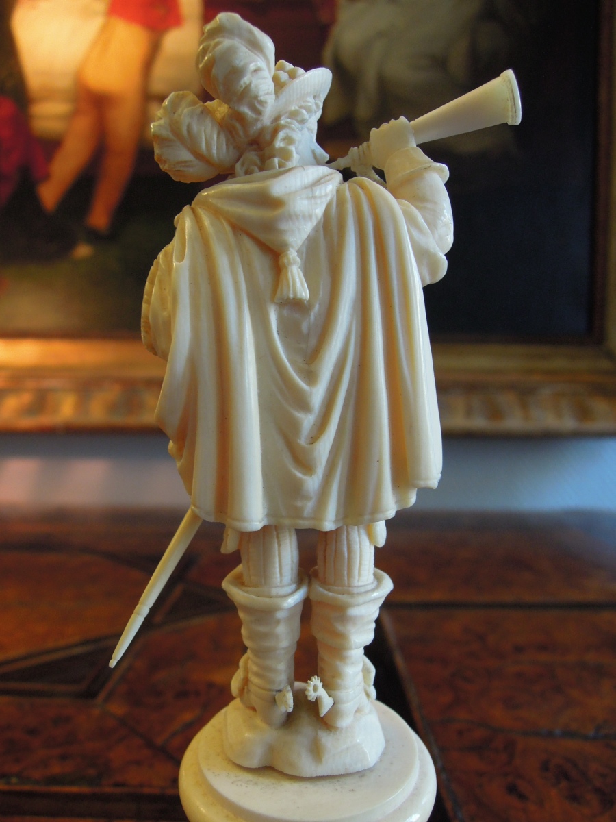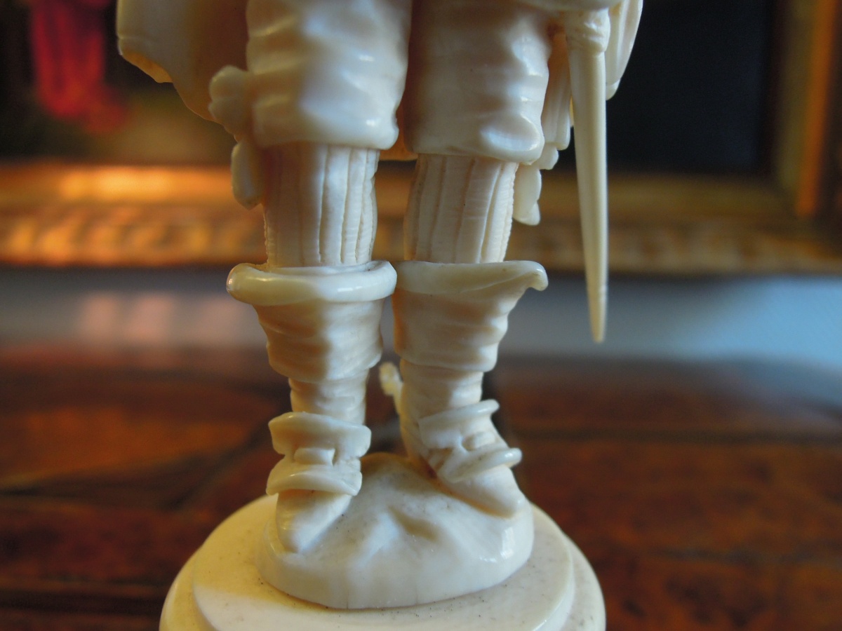 * - MOUSQUETAIRE SONNANT.Ivoire sculpté en ronde bosse figurant un homme d'armes élégament vêtu et chaussé sonnant sur une colonne dorique en ivoire. DIEPPE (?), fin du XIXème. Haut. 10,3, Haut. totale 16,5 cm.