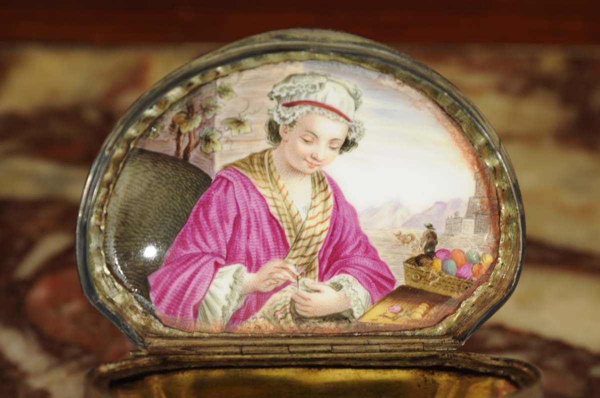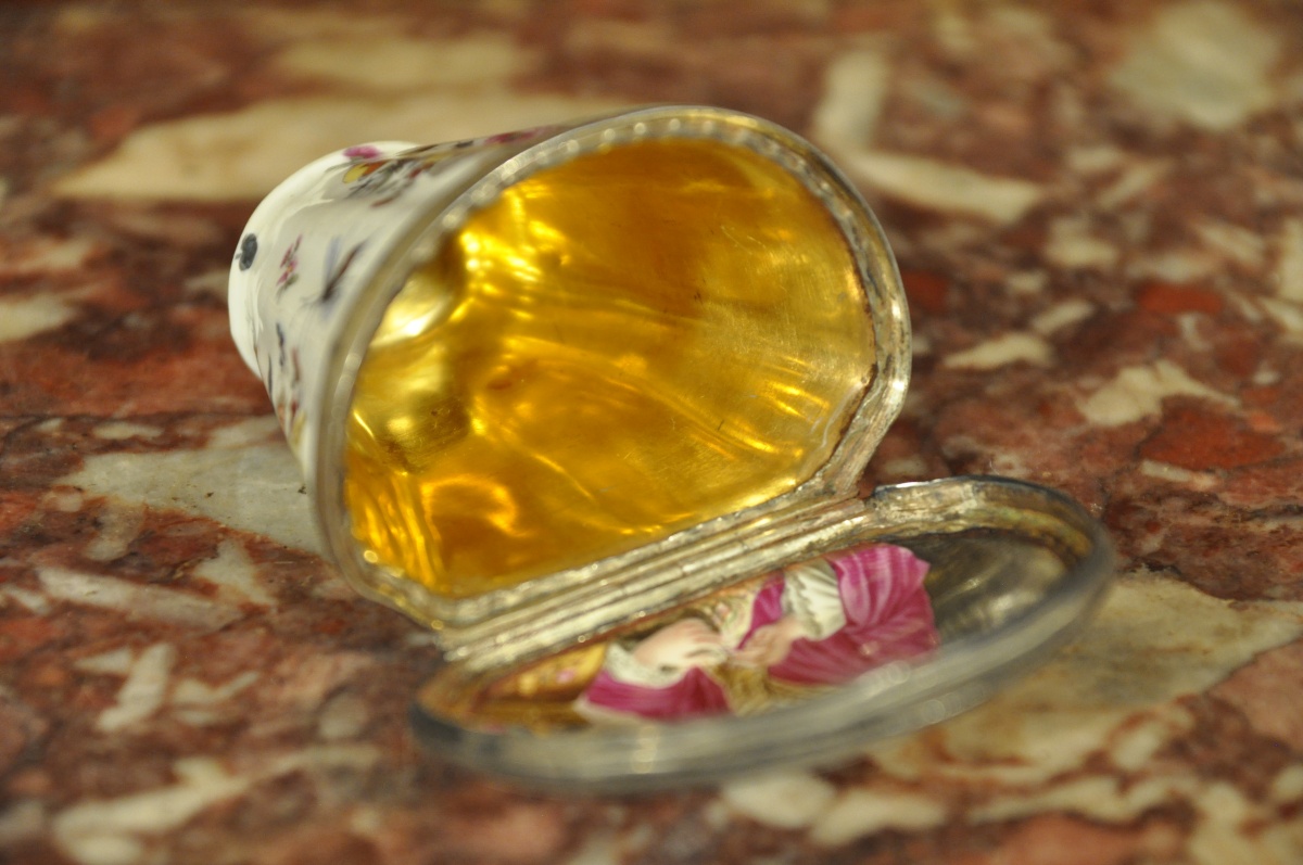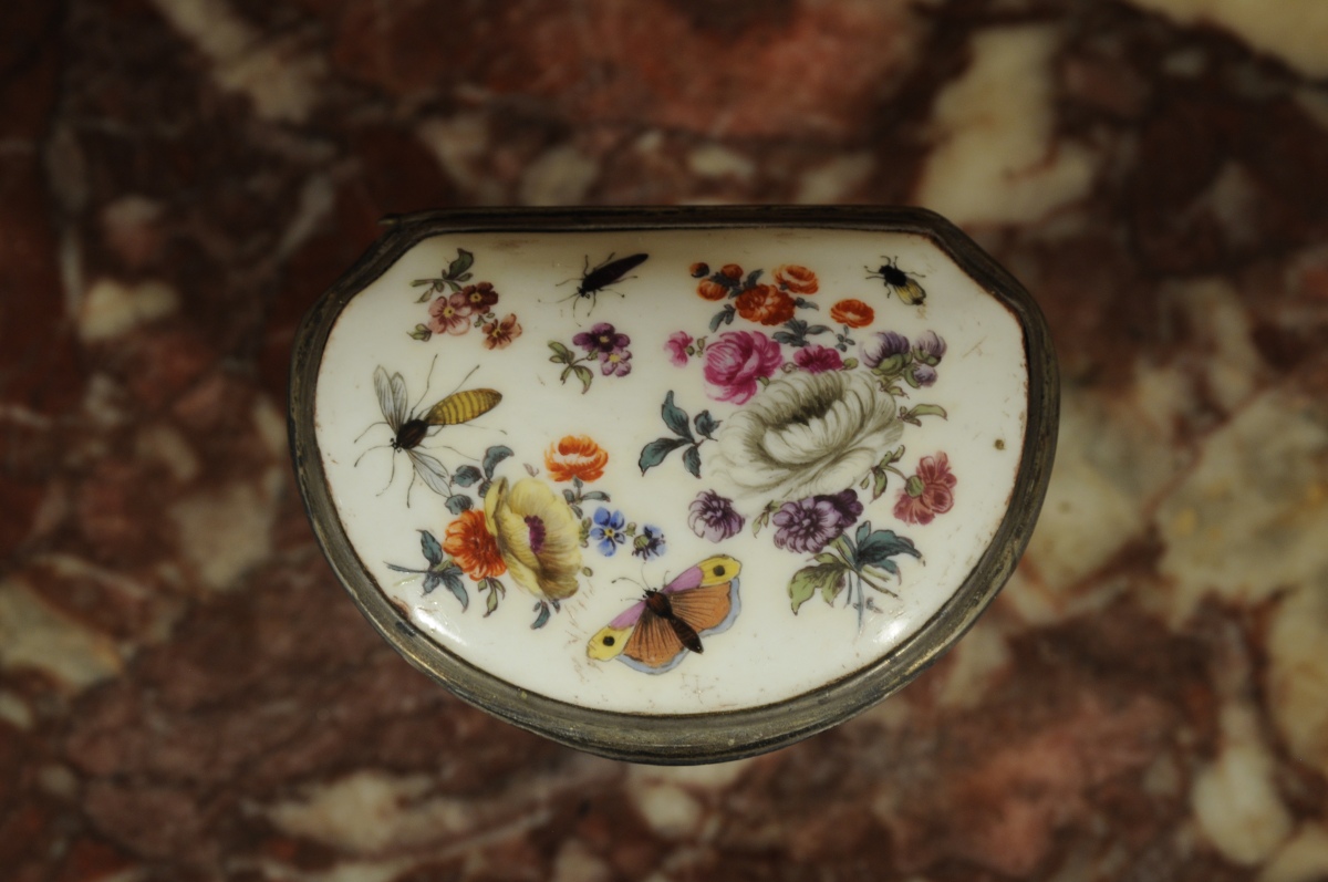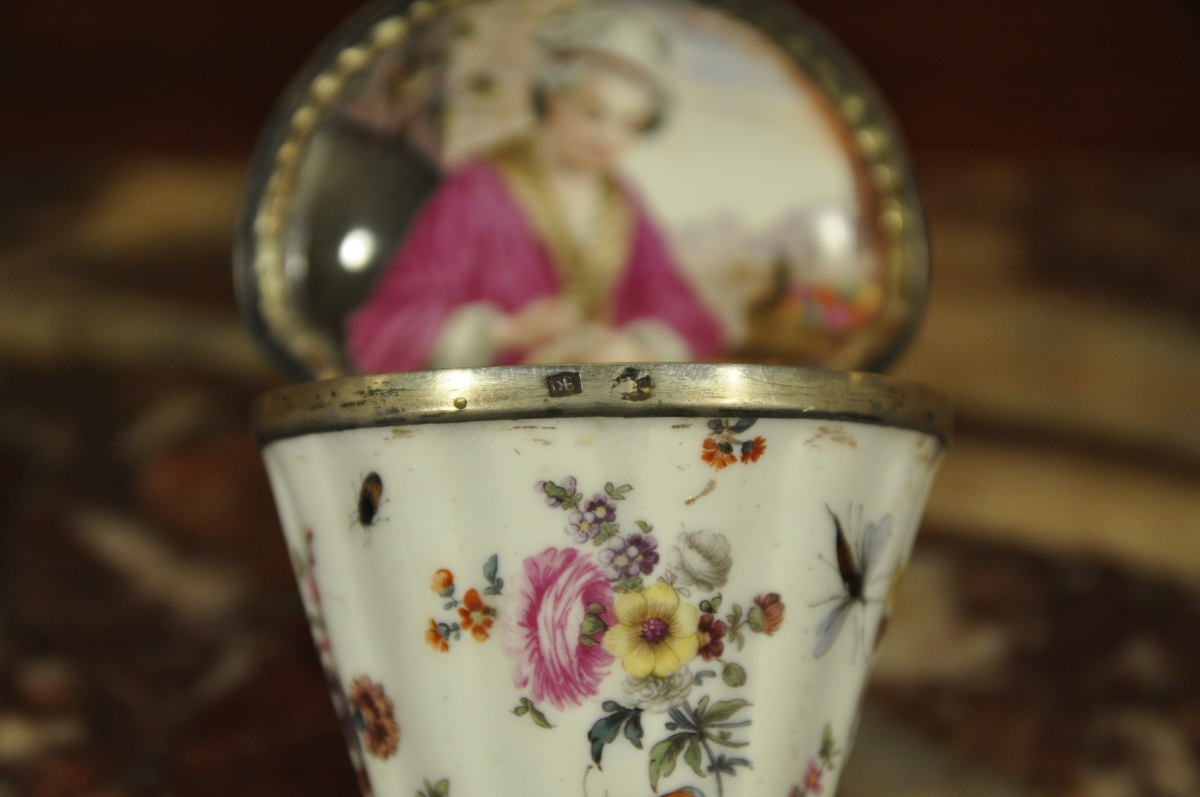 MEISSEN. BOITE en porcelaine de forme cornet ondée, décor polychrome de fleurs et insectes, l'intérieur du couvercle représente une femme à ses travaux de couture, l'intérieur du cornet revêtu d'or. Monture en argent étranger. Fin du XVIIIème.