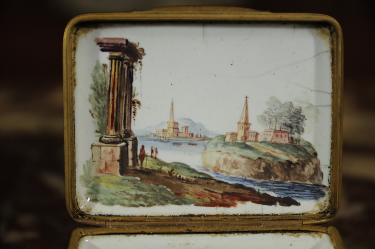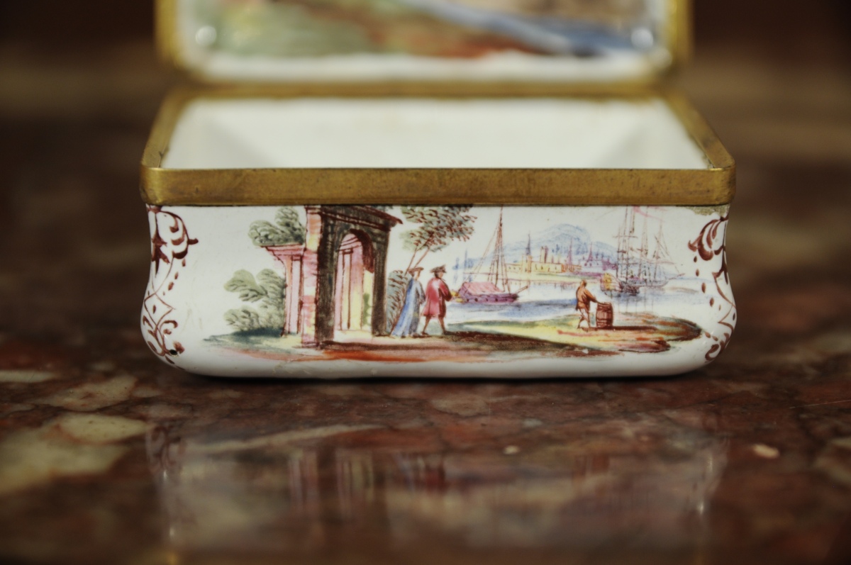 Joint: Une petite BOITE en porcelaine de forme cornet à décor polychrome et une BOITE en faïence de forme rectangulaire à décor polychrome de scènes maritimes, cerclée de métal doré.