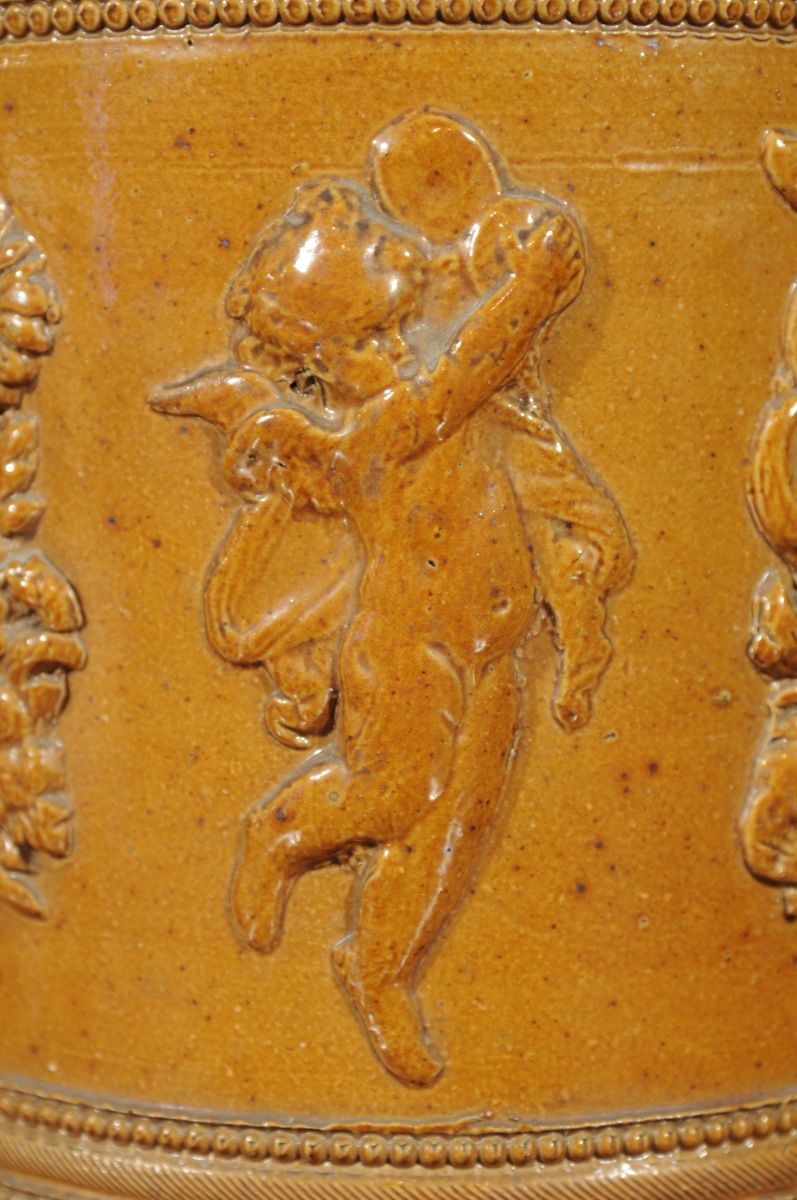 BEAUVAISIE. POT COUVERT en grès à décors moulé d'amours musiciens et de bouquets fleuris. Couvercle en étain. XIXème.