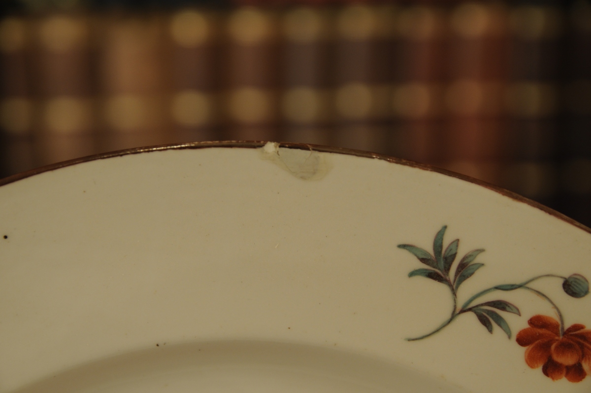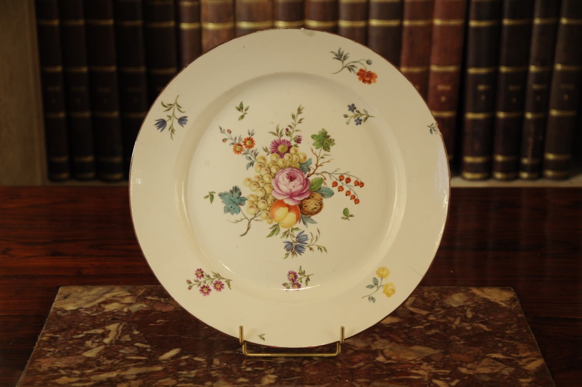 SAXE. PLAT rond à bord uni, décor polychrome au centre de fleurs et fruits et sur l'aile de jetées de fleurs. Filet brun sur le bord. fin XVIIIème.