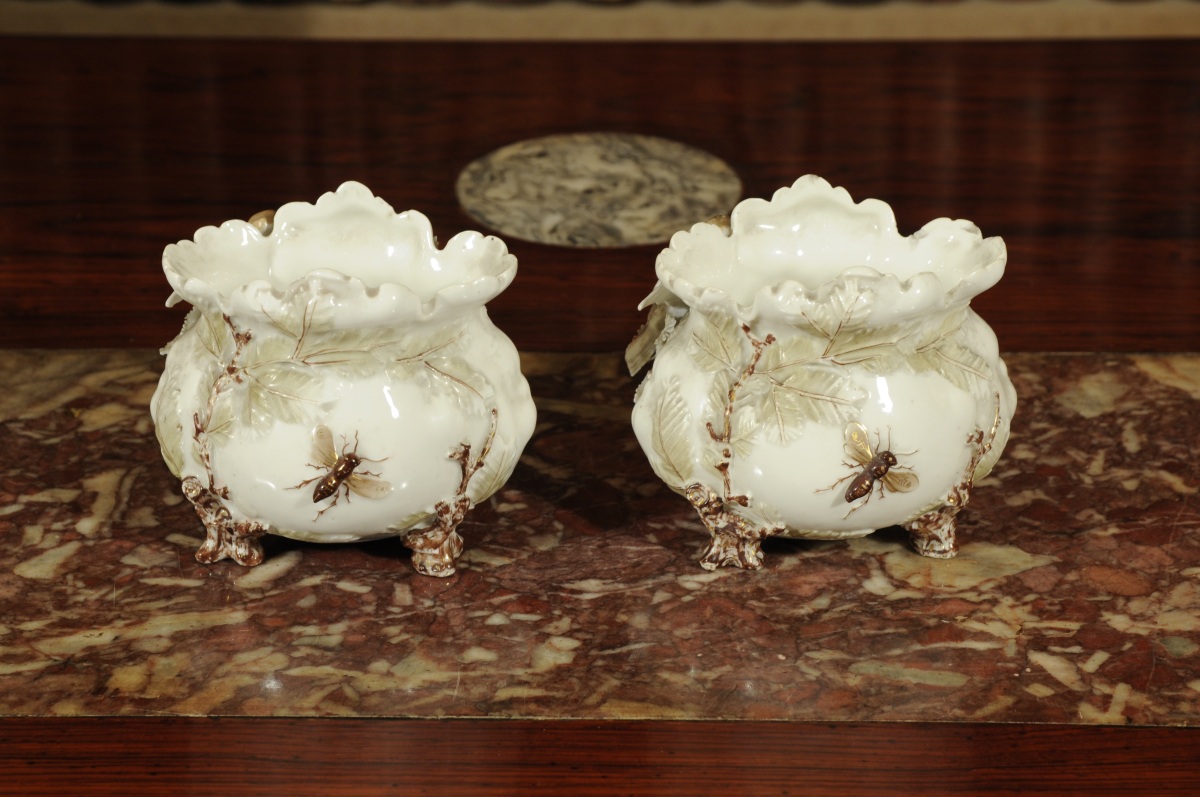 SAXE (?). Paire de petites BOUQUETIÈRES en porcelaine de forme mouvementée à décor appliqué d'insectes et d'oiseaux reposant sur quatre pieds de vigne. Marqué V en bleu au revers. Début XIXème.