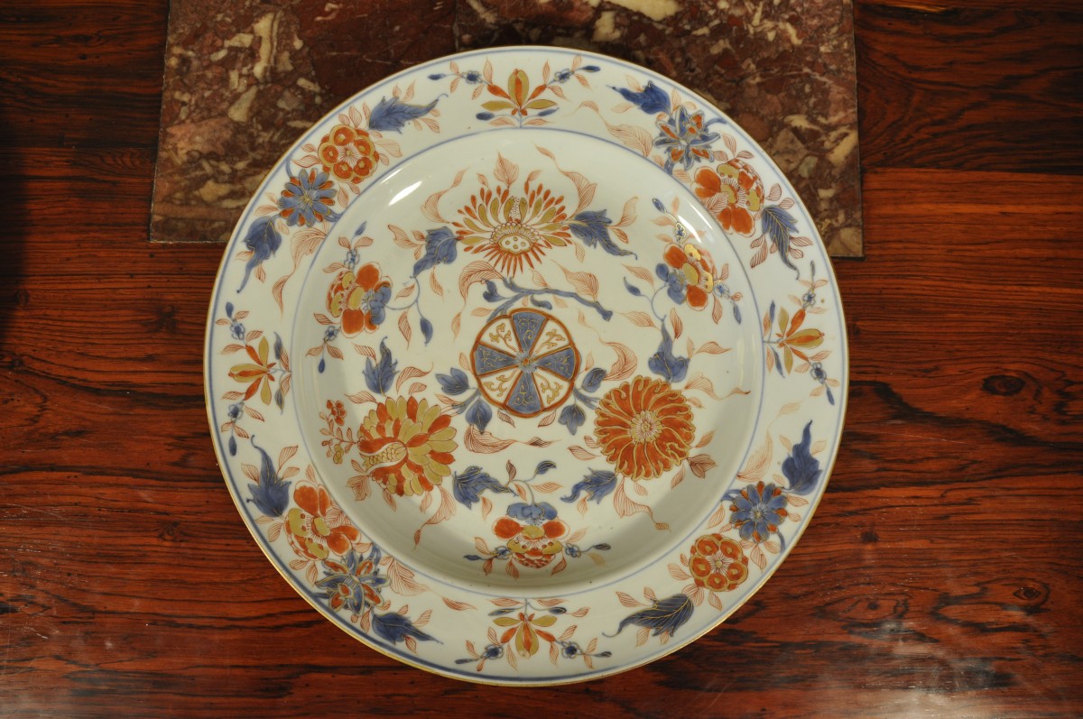 CHINE. COMPAGNIE DES INDES. Suite de cinq grands PLATS en porcelaine à décor "Imari" bleu, rouge et or de larges fleurs et guirlandes fleuries.