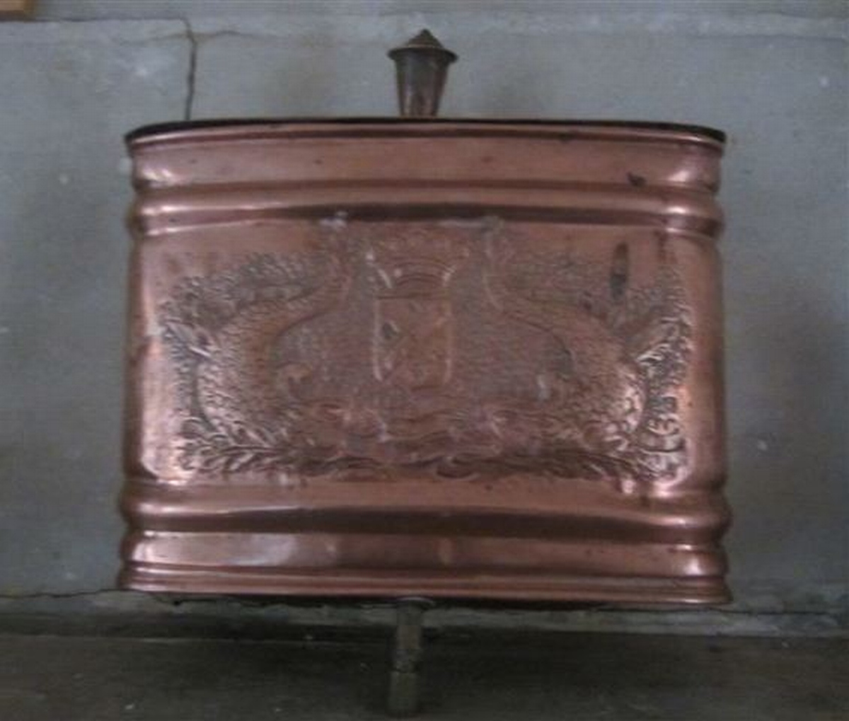 FONTAINE formant lave-main en cuivre, le réservoir armorié aux dauphins et la cuvette fleur-de-lysée. Travail ancien.