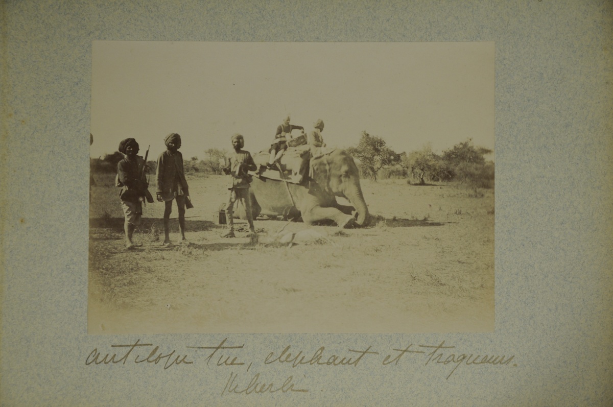 Légendes de l'auteur à l'encre sous chaque image sur le carton de montage dont "éléphants avant le départ, la chasse, scènes et types indigènes, avant la battue des sangliers, les chevaux de chasse, lanciers, d'escortes, antilope tuée, éléphants et traqueurs, l'équipage de lévriers du Maharadja Sandia, panthère tuée, tombeaux hindous