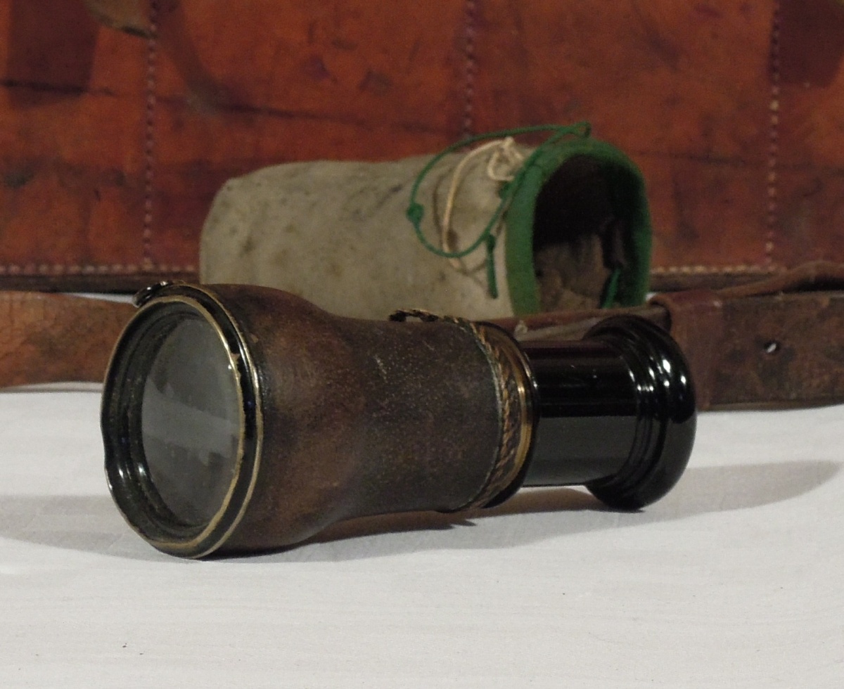 JUMELLE en laiton laqué et rehauts d'or gainé de cuir foncé, dans un étui en peau. Travail anglais de la fin du XIXème. Long. (fermée) 8,5, Long. (ouverte) 11 cm.