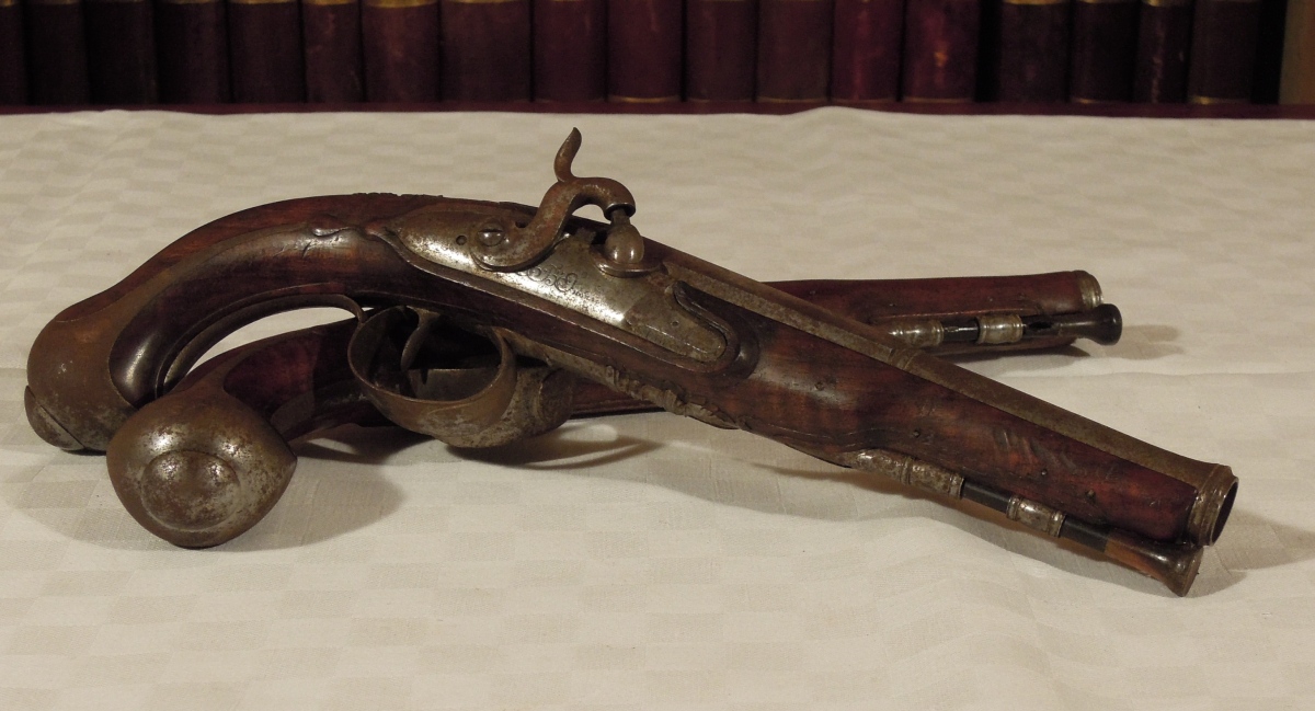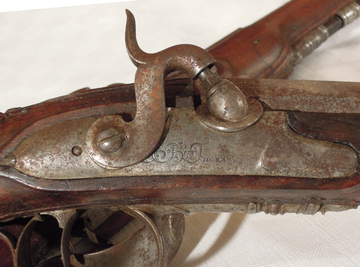 Paire de PISTOLETS À PERCUSSION. Canons ronds en acier à départ octogonal marqués " Canon Torde ". Platine en acier gravée " Bte Thomas à St Etienne ".Crosse en noyer sculpté de fleurettes.