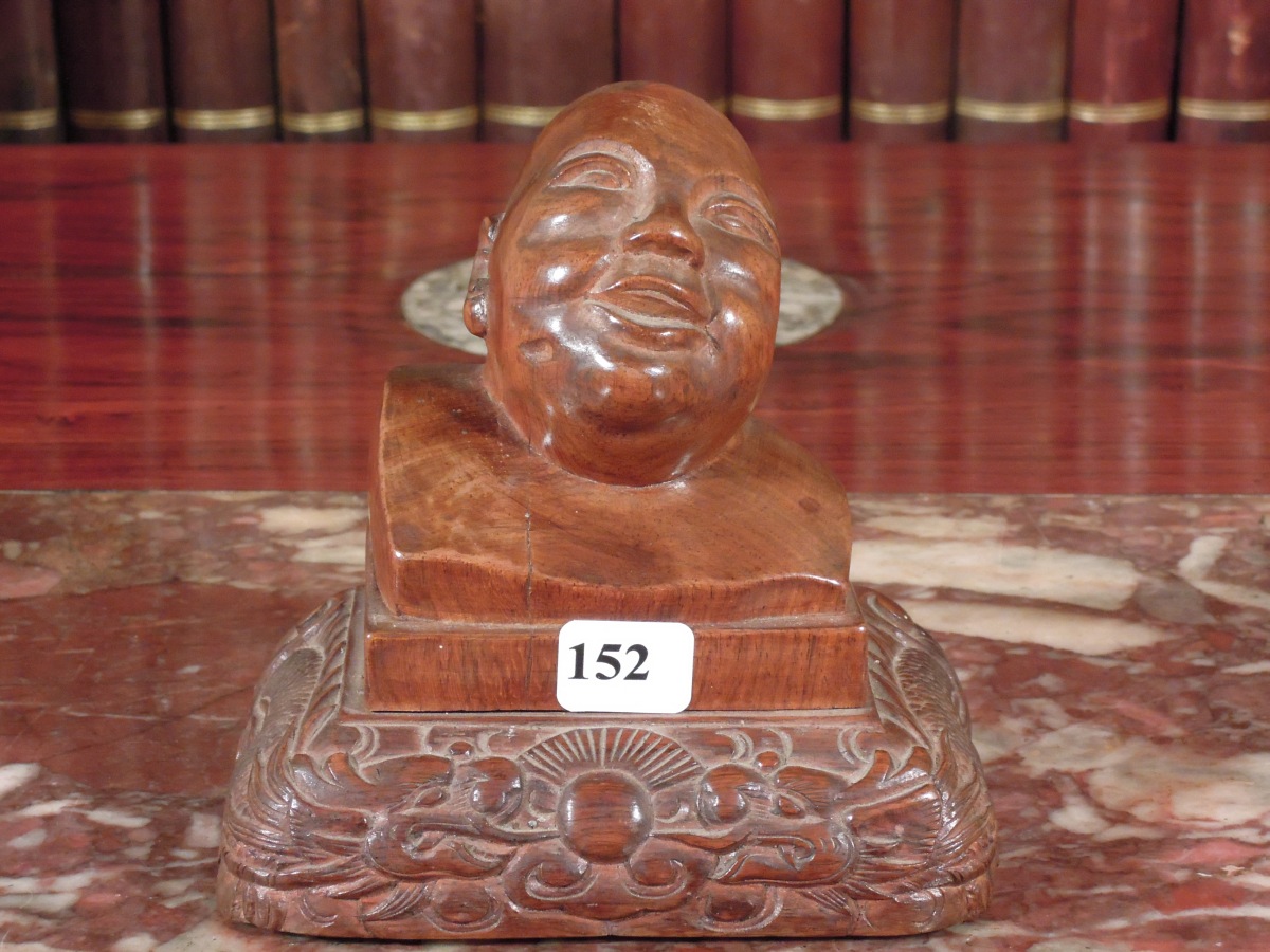 TÊTE JOVIALE en bois sculpté sur un socle en bois décoré de dragons affrontés. Haut. 12, Larg. 13, Prof. 10 cm.