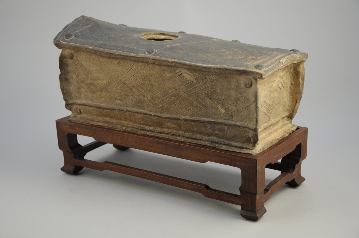 URNE FUNÉRAIRE en terre cuite à traces d'engobe rouge à décor de cercles concentriques, sur un socle en bois.