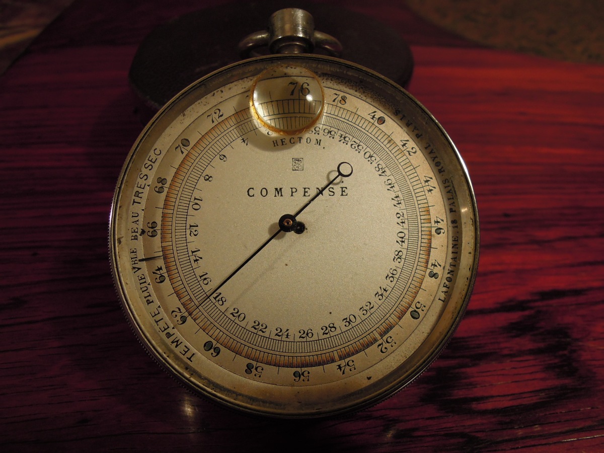 BAROMÈTRE HECTOM en métal argenté, dans un étui gainé de cuir bordeaux, le cadran en acier signé " Lafontaine 18, Palais Royal Paris ". Fin XIXème-Début XXème ".