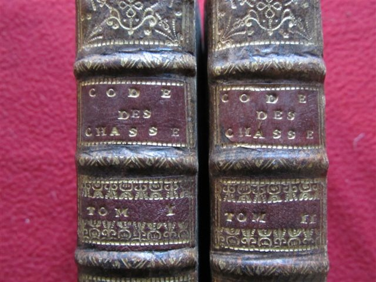 Code des chasses. Paris, chez Saugrain, 1713. Deux volumes in-8 de 470 et 443 pages. Ex-libris: marquis de Biencourt, Biencourt-Poncins. Reliure en plein maroquin aux armes sur les deux plats à l'or des Biencourt Poncins. Dos nervuré et gaufré à l'or.