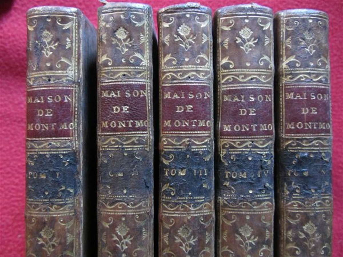 M. DESORMEAUX. Histoire de la maison de Montmorenci. Paris, Desaint &Saillant et Duchesne , 1764. Cinq volumes in-8 d'environ 450 pages. Ex Libris: Desforges, Le Marquis de Biencourt, Vte Edmond de Poncins. Reliure en plein veaux aux armes à l'or de Biencourt Poncins, le dos nervuré et gaufré à l'or. Édition originale rare.