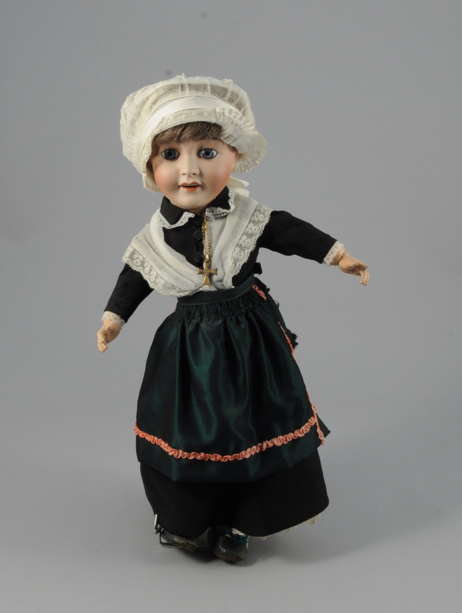 POUPEE TOURANGELLE, tête porcelaine, bouche ouverte, yeux sulfure bleus, oreilles percées, cheveux blond. Corps en papier mâché, bras et jambes articulés. Coiffée d'un bonnet tourangeau en dentelle blanche, d'un jupon et d'une châle en dentelle, d'un tablier vert sur une blouse noire, petits souliers de cuir noir, croix pectorale en métal doré. Signée "FABRICATION FRANCAISE FAVORITE n°7 Ed. Tasson AL & Cie Limoges". Hauteur: 47,5 cm (index gauche accidenté, doigts retaurés, éclat au lobe de l'oreille gauche).