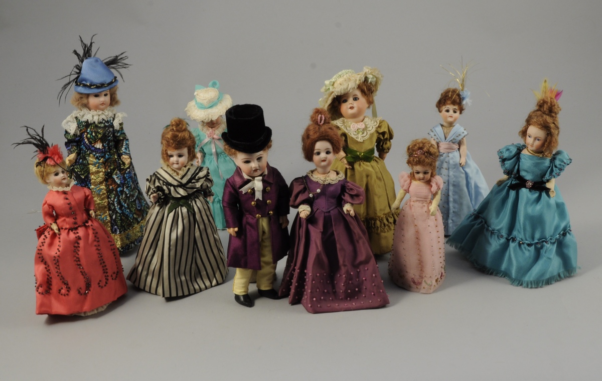 LOT comprenant DIX POUPÉES de mode, tête en biscuit, réhabillées. Fin XIXème-Début XXème. Tailles diverses. (légères usures)