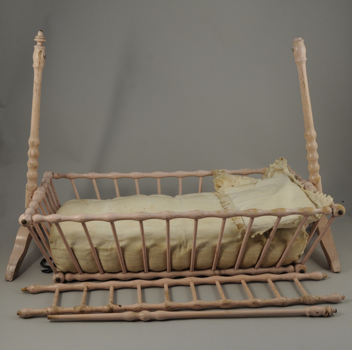 BERCEAU NACELLE en bois tourné et peint en rose garni d'un matelas et d'un oreiller. Ciel de lit en tulle blanc. Fin XIXème-début XXème. Haut. 114, Larg. 73, Prof. 36 cm. (accidents au piètement)