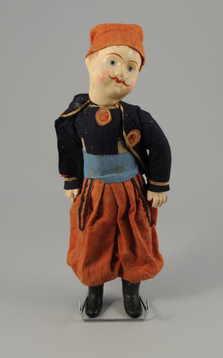 POUPÉE représentant un zouave. Tête et corps en composition, cheveux, bouches et yeux peints. Vêtu d'un costume en feutre. Fin XIXème. Haut. 40 cm.