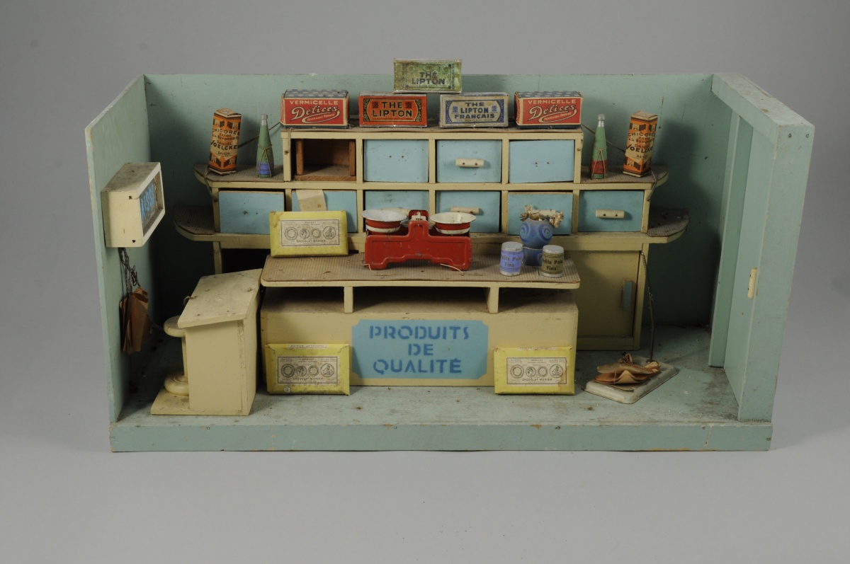 ÉPICERIE miniature en bois peint comprenant un comptoir, un meuble grainetier, une caisse, une balance et diverses marchandises. Première moitié du XXème. Haut. 30, Larg. 60, Prof. 23 cm. (usures)