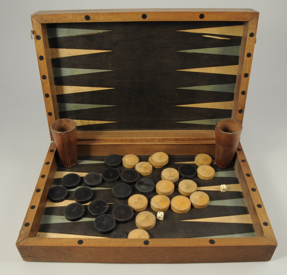 JEU de BAGGAMON combiné à un JEU de DAMES en bois naturel et bois teinté, godets en cuir. Début XXème. Long. 43, Larg. 27 cm. (usures, un jeton rapporté)