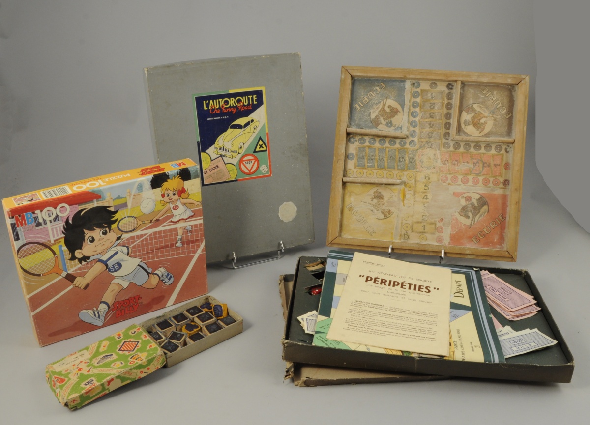 JOINT: LOT de JEUX comprenant: "L'Autoroute", "Peripeties", puzzle, petits chevaux (accidenté) et tampons. Milieu et fin XXème.
