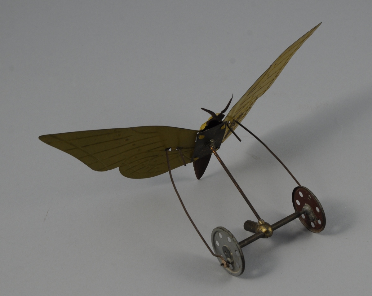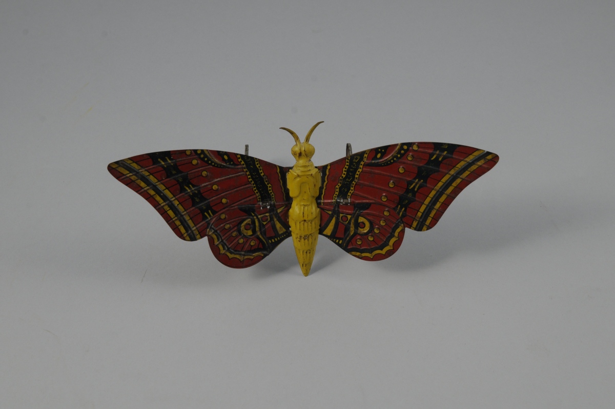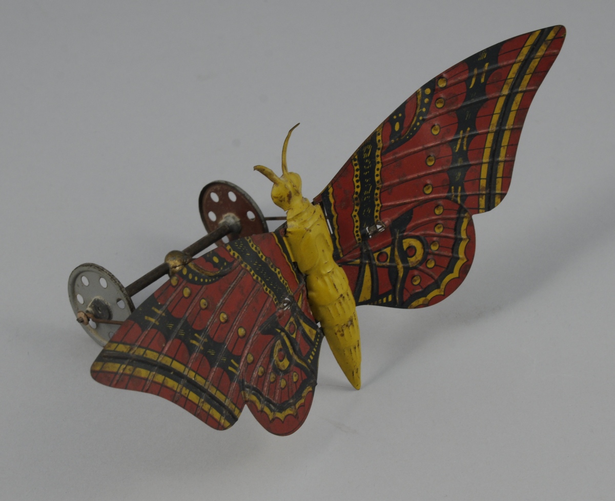 PAPILLON en tôle peinte jaune, rouge et noir, ailes mobiles, monté sur roulettes. Fin XIXème. Haut. 10, Long. 23 cm. (manque le manche)