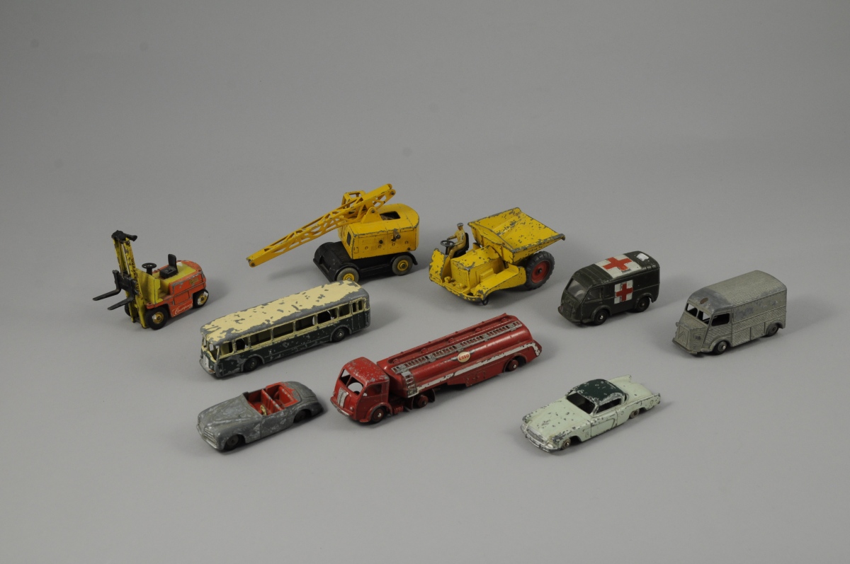 DINKY TOYS. 1/43ème. LOT de 9 unités comprenant: une voiture Simca 8 Sport (manque un pneu arrière), une voiture Studebaker Commander (manque pneus), une camionette Citroen 1200K (manque une porte), une ambulance militaire, un autobus parisien "Somua Panhard", un camion citerne Esso avec tracteur panhard et citerne Titan 32 C (manque cinq pneus), un tombereau Muir-Hill Dumper avec chauffeur (manque roues avant et attaches de la benne), une grue Coles Mobile Crane avec chauffeur et un chariot élévateur Conveyancer. (usures, sans boîtes)
