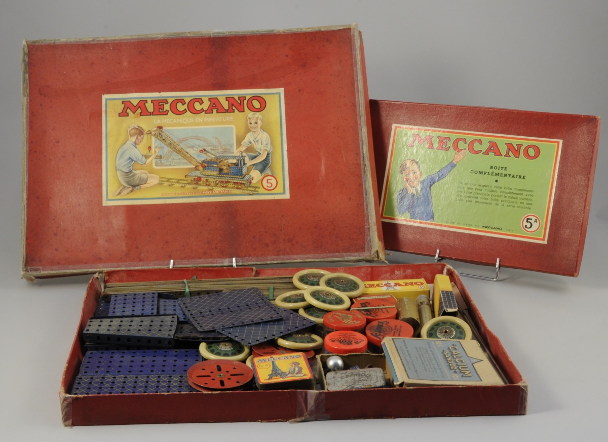 MECCANO France. Boîte N°5 avec ensemble de pièces dont roues, poulies, plaques, cornières. Milieu du XXème. (accidents au cartonnage)