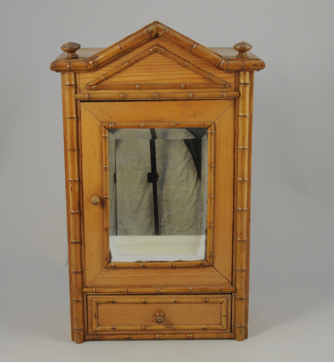ARMOIRE à glace de poupée en pitchepin ouvrant par un vantail et un tiroir en partie basse, fronton triangulaire. Fin XIXème-début XXème. Haut. 51, Larg. 29, Prof. 15 cm.