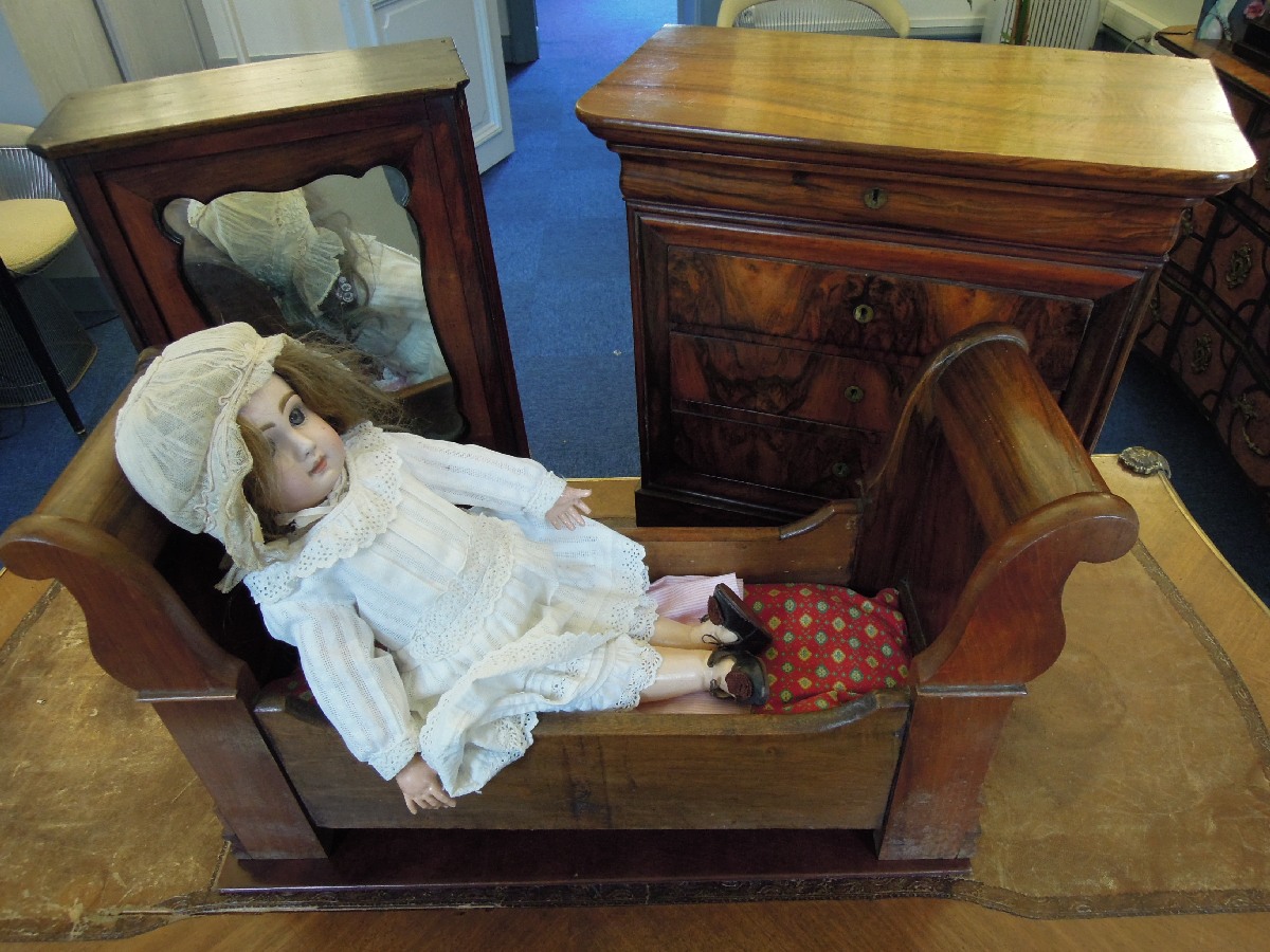 MOBILIER DE POUPÉE comprenant: un LIT BATEAU en bois de placage (Haut. Long. Prof. com), une COMMODE LOUIS-PHILIPPE en bois de placage ouvrant à quatre tiroirs dont un en doucine (Haut. 48,5 Larg. 45,5 Prof. 25 cm) et une ARMOIRE À GLACE en bois de placage ouvrant à une porte et un tiroir. (Haut. 49,5 Larg. 31, Prof. 16 cm)