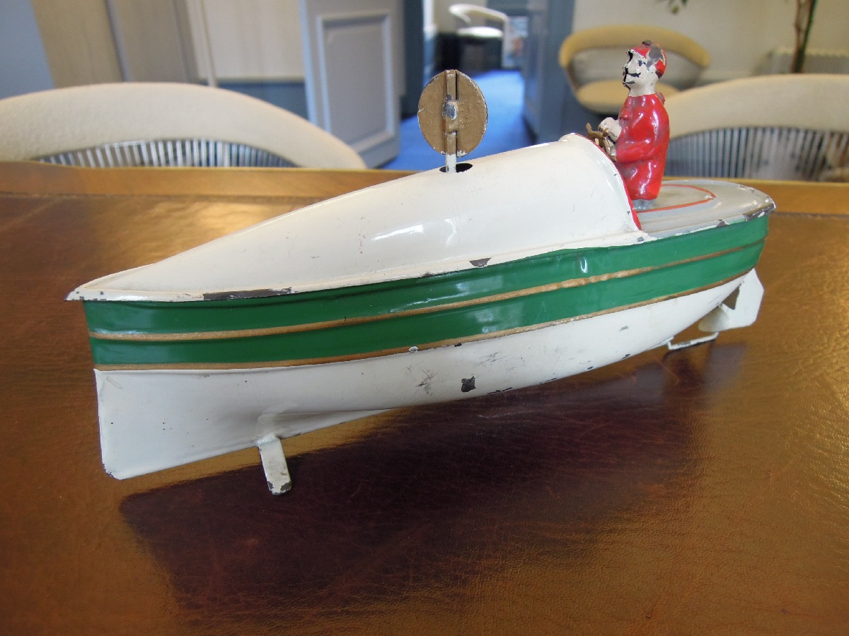 CANOT AUTOMOBILE à remontage manuel, laqué vert beige à bandes vertes et dorées, avec son pilote en tenue rouge. Long. 22, Haut. 9,5 cm (petits éclats et manque à la peinture).