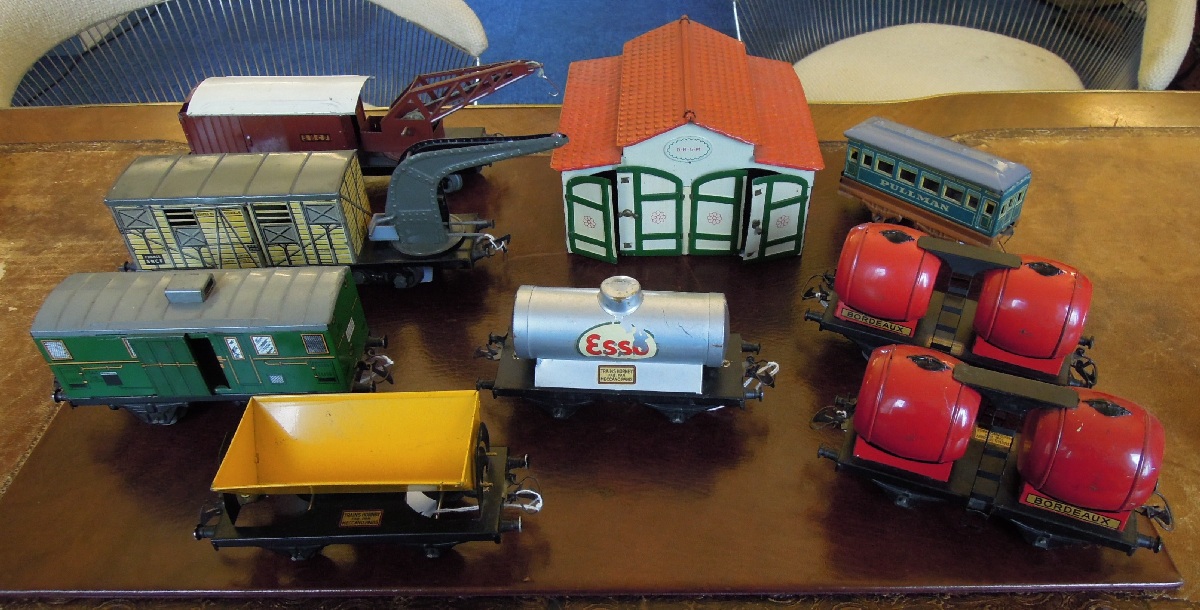HORNBY. ENSEMBLE ARTICULÉ comprenant sept WAGONS en tôle peinte: BENNE A BASCULE de couleur jaune SNCF, ATELIER de couleur verte, BÉTAILLERE-GRUE SNCF de couleur jaune, GRUE DE CHANTIER de couleur marron, CITERNE ESSO de couleur aluminium et deux wagons DOUBLE CITROËN BORDEAUX de couleur rouge.