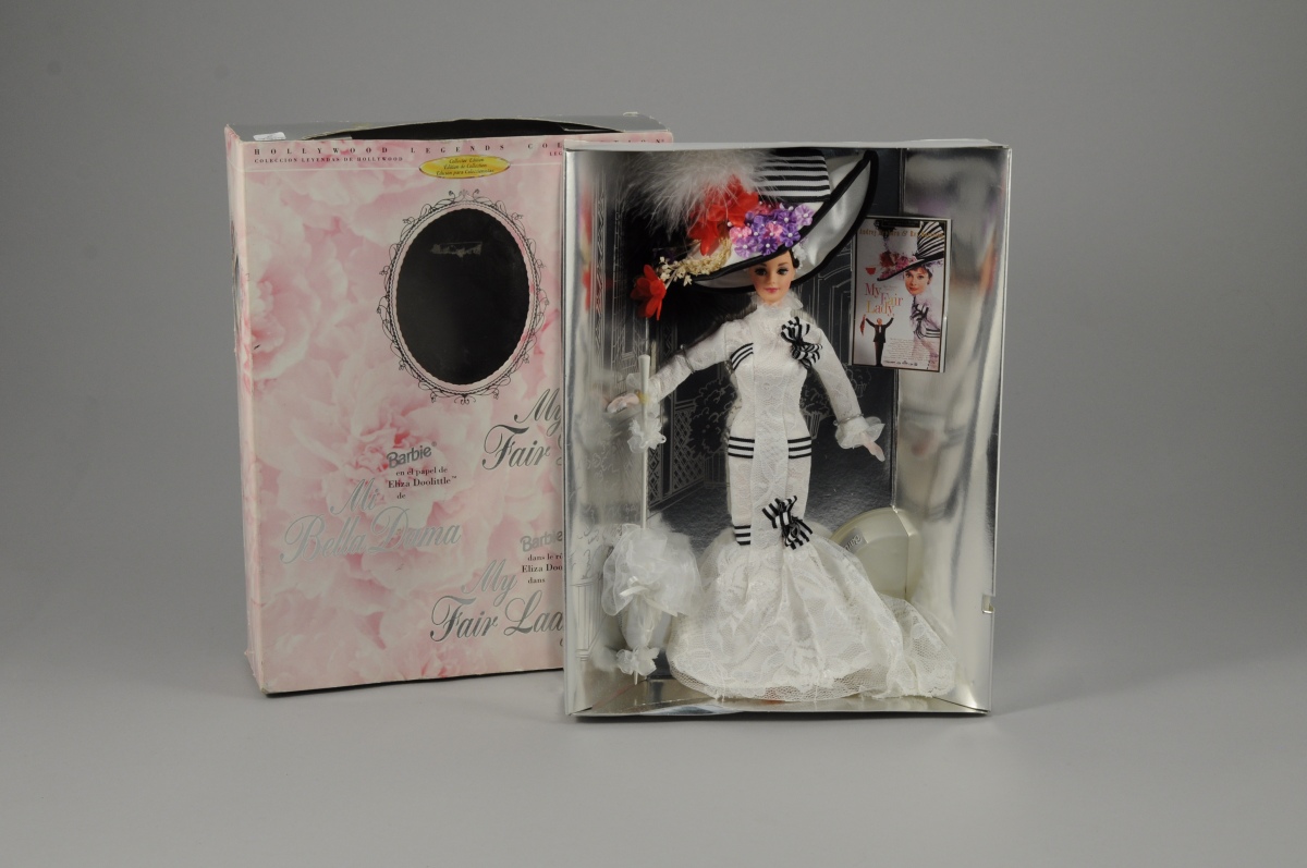 POUPÉE BARBIE à l'éffigie d'Eliza Doolittle dans le film My Fair Lady. Robe et ombrelle en dentelle blanche et rubans noirs et blancs, chapeau fleuri. Collection Hollywood Legend. Dans sa boîte d'origine. 1996. Haut. 29 cm, Haut. de la boîte 35, Larg. 26, 5 cm. (légères usures au cartonnage)