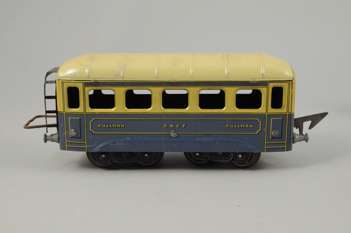 JEP. LOT comprenant une voiture Pullman, deux fourgons et un fourgon porte-grue, en métal laqué. Long. de la voiture Pullman 19 cm. (légères usures et oxydations)
