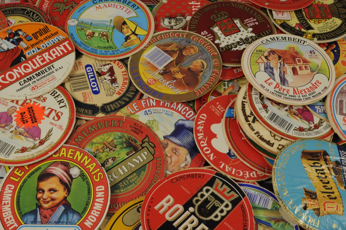 RÉUNION de 195 ÉTIQUETTES de CAMEMBERT dont: Le Père Alexandre, Les Prélats, Les Deux Falaisiens, Le P'tit Caennais et Le Délectable. (légères usures)
