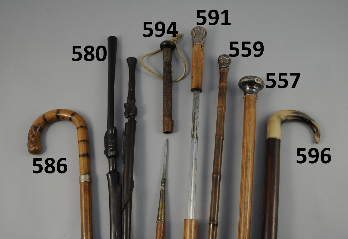 CANNE avec pommeau en métal argenté, centré d'un cartouche formé de faisceaux. Fût en jonc de Malacca et bouterolle en métal argenté. Haut. 92 cm.