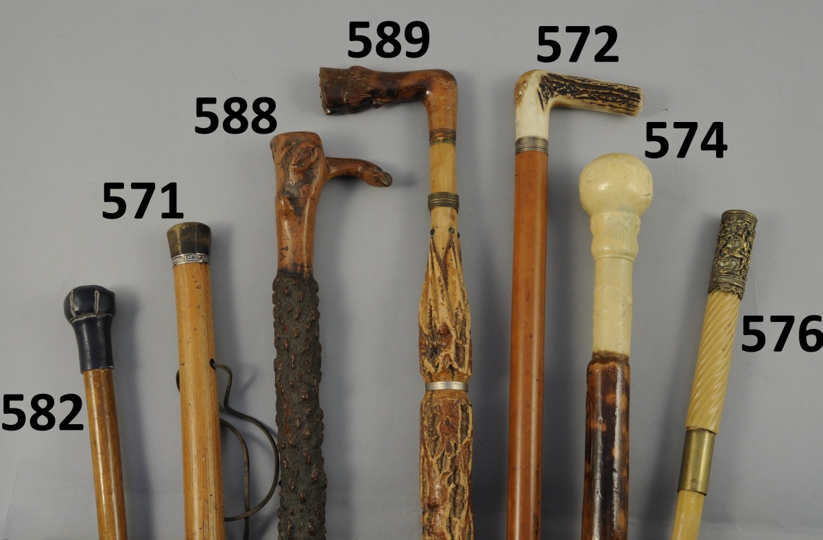 CANNE avec pommeau à ergot taillé dans une branche d'arbre. Fût en placage d'écorce rugueuse et bouterolle en laiton. Maquée "IV" et "VI" sur le pommeau. Haut. 90,5 cm. (éclats et fentes)