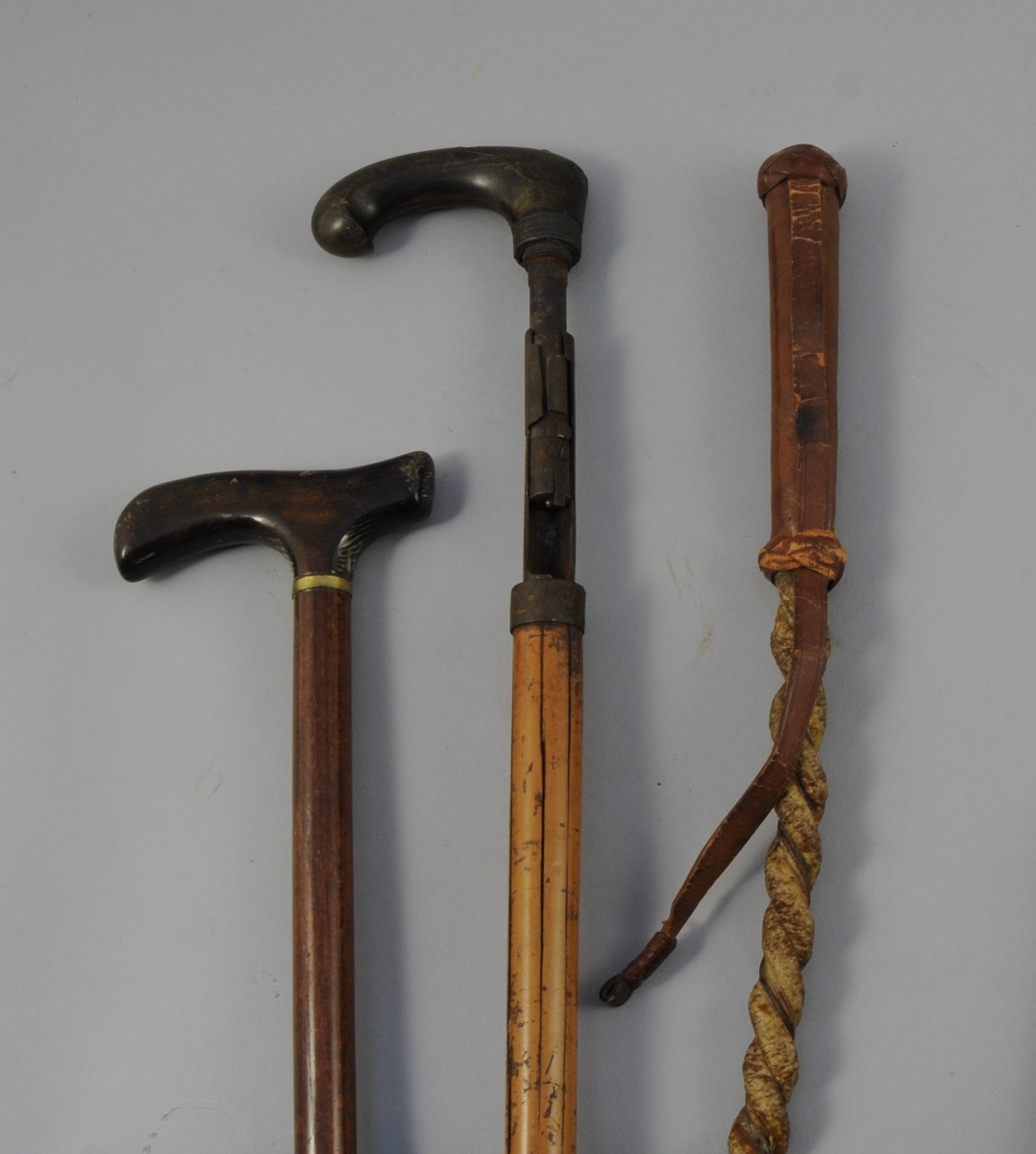 CRAVACHE. Le fût en nerf de buf torsadé. Montures en cuir brun. Long. 78,5 cm.