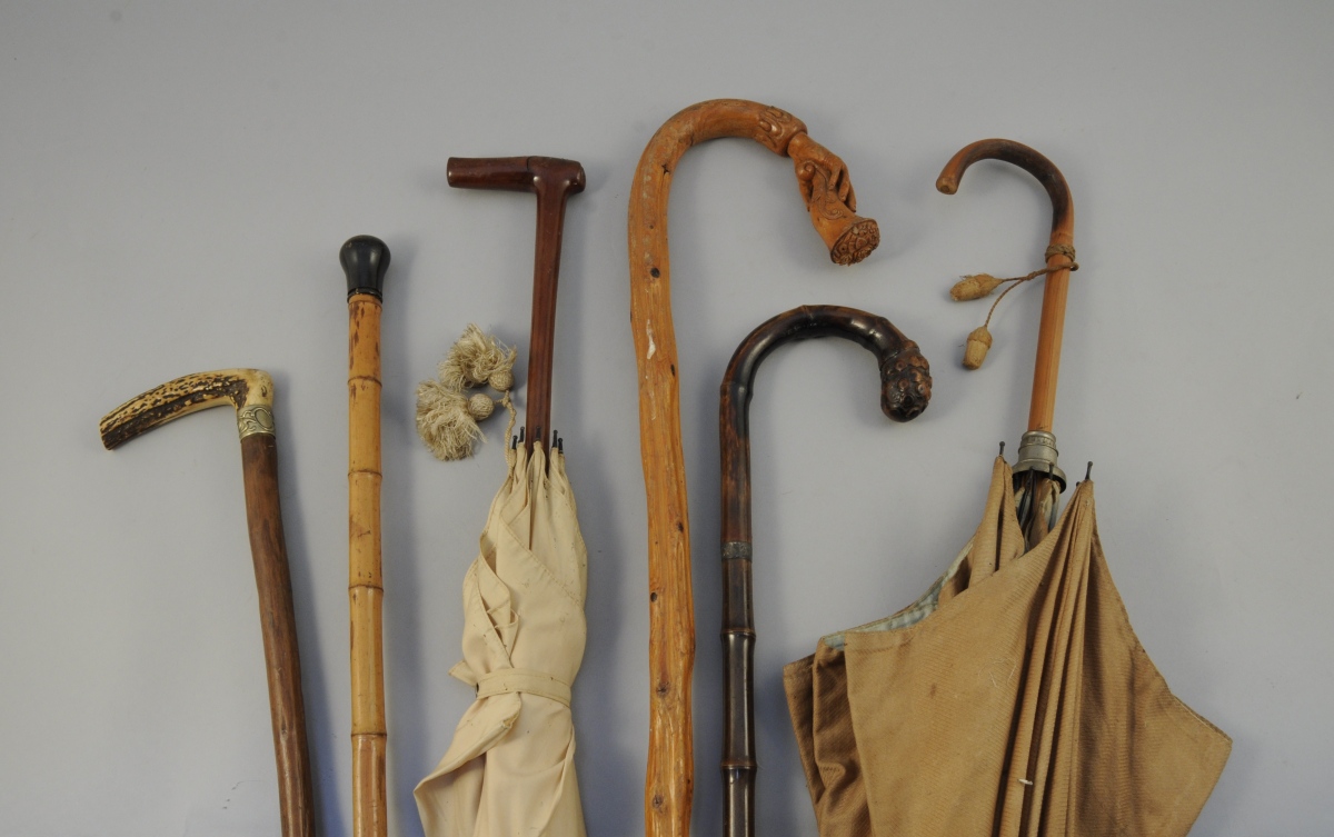 Collection de 18 CANNES et OMBRELLES dont une canne en bois sculpté , le pommeau recourbé figurant une main retenant une corne d'abondance fleurie ou encore une canne, le pommeau équerre en corne de cervidé.