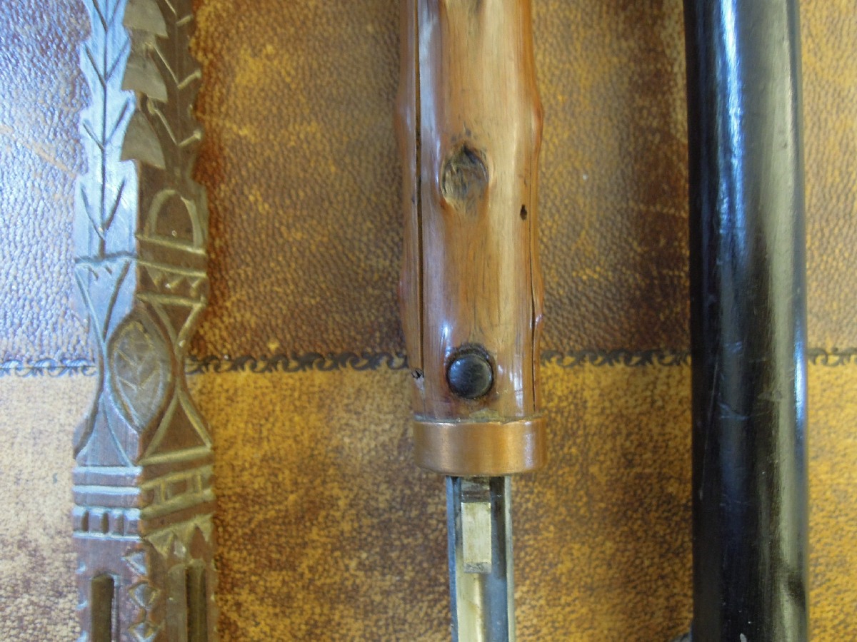 CANNE-EPEE en bois ronceux, cuivre et métal argenté, lame effilée. Long. 89,5.