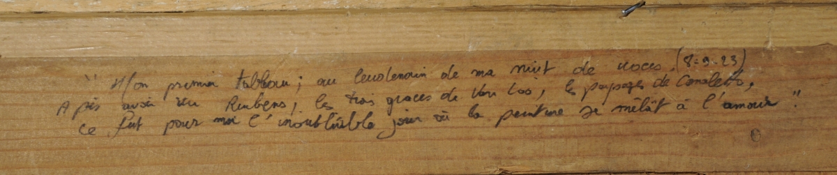 Au dos, annotation du peintre: "Mon premier tableau; au lendemain de ma nuit de noces (8-9-23). Après avoir vu un Rubens, les trois grâces de Van Loo, les paysages de Canaletto, ce fut pour moi l'inoubliable jour où la peinture se mêlât à l'amour".