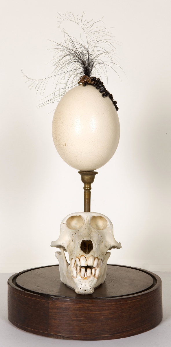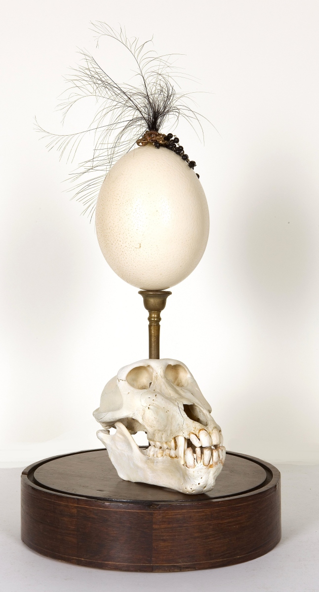L'uf d'autruche a été décoré, à son sommet, d'un plumet et de divers petits chapelets de perles noires. Il surmonte à l'aide d'une tige en laiton un crâne de singe (probablement un babouin). Le montage est présenté sur un socle cylindrique en bois.