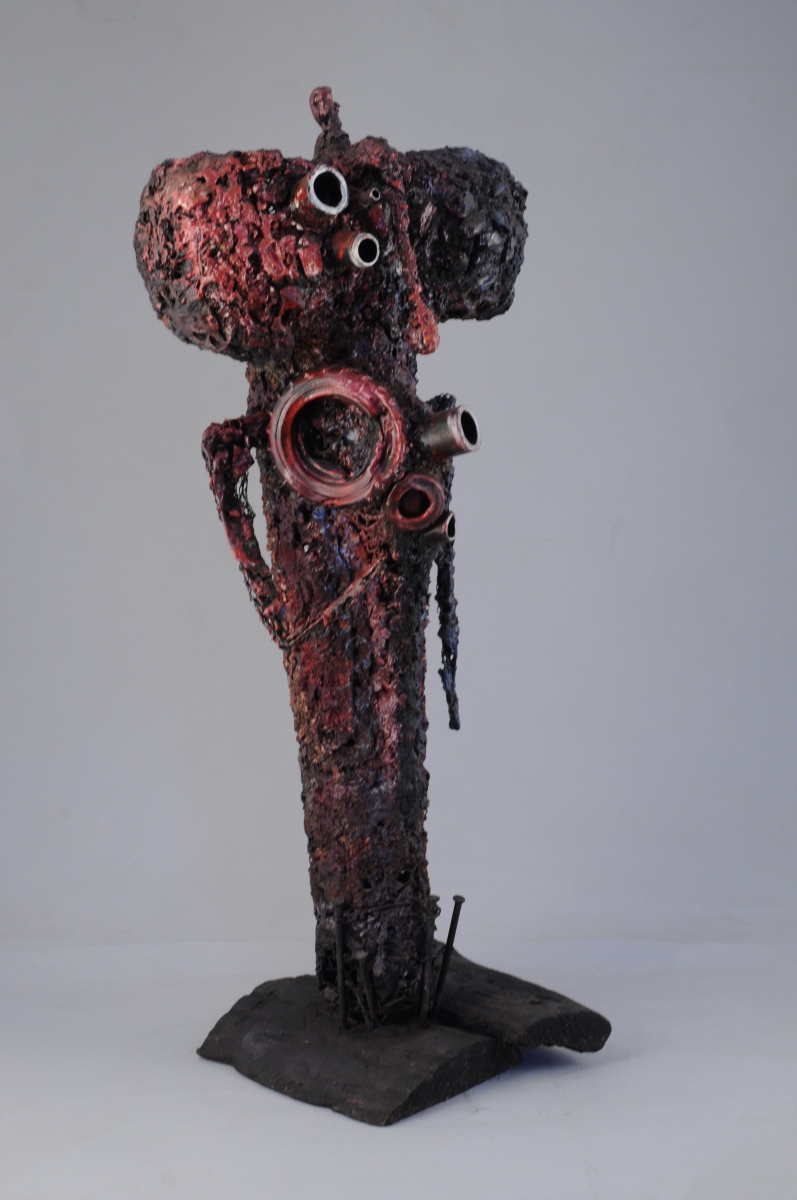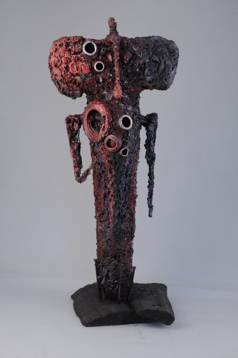 Sculpture en grillage, plastique fondu, bois brûlé, incrustation de clous et peinture, sur un socle de bois brûlé.