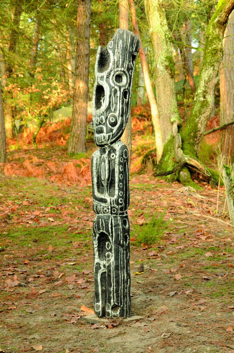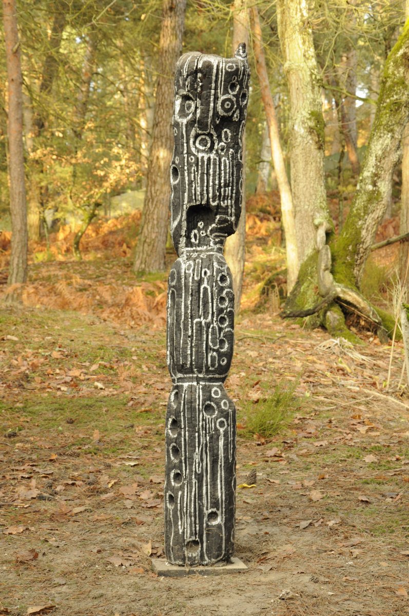Sculpture en bois brûlé créé pour l'exposition en 1960 chez Camion, rue des Beaux-arts à Paris, peinte vers 1980.