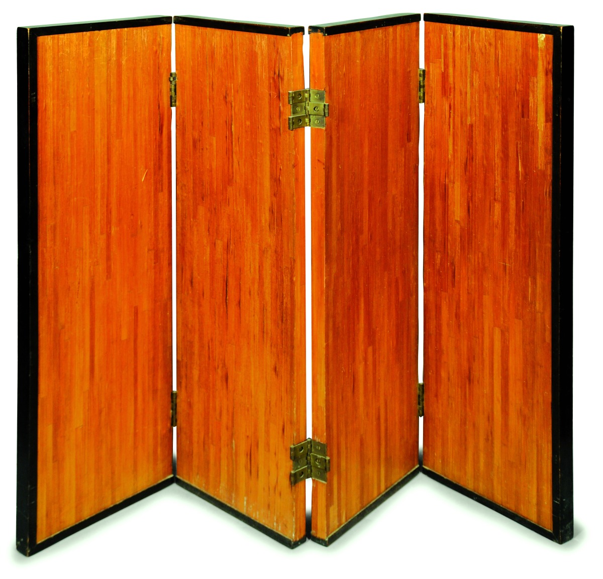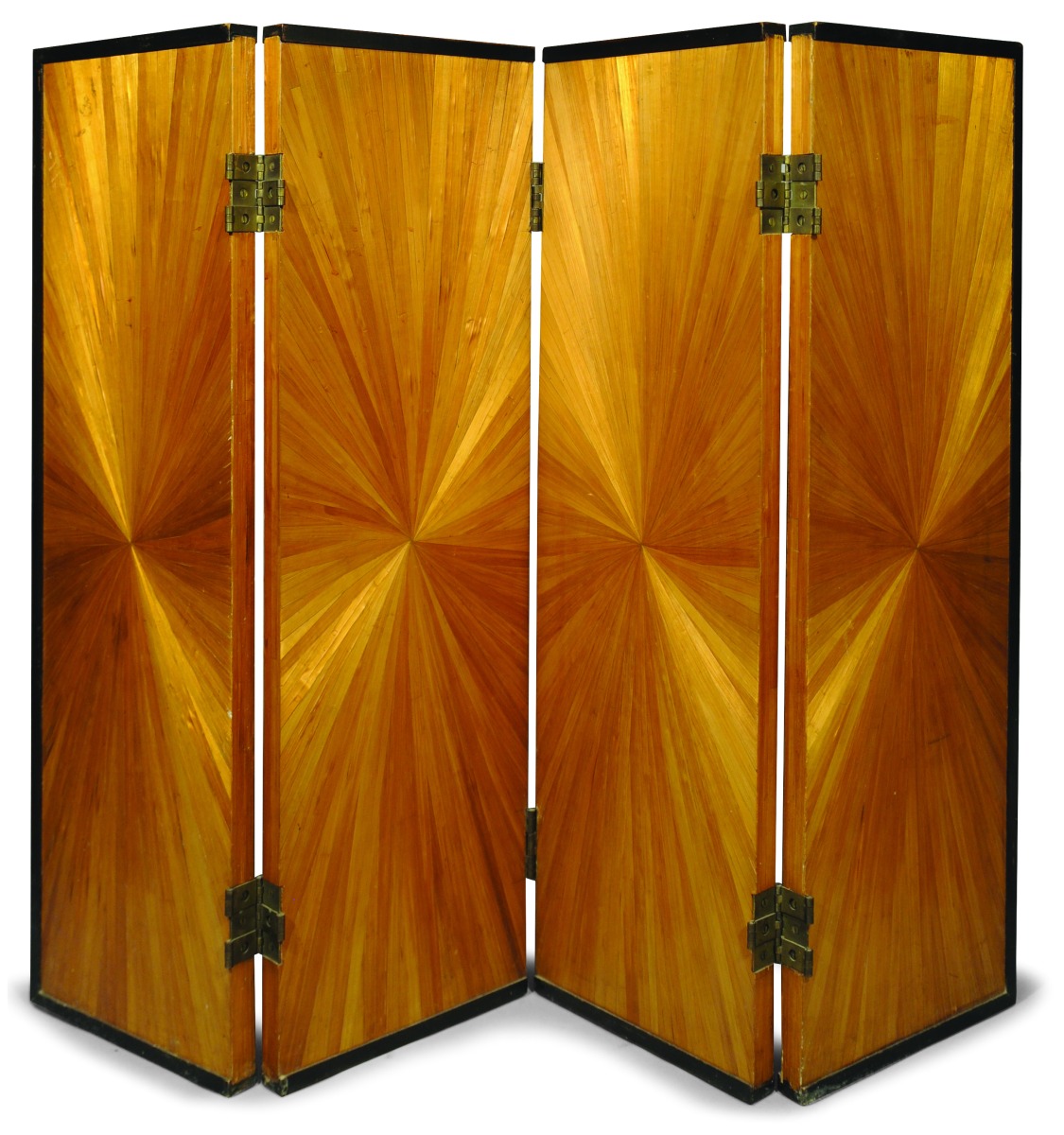 PARAVENT ancien en marqueterie de paille. Quatre feuilles double faces: motifs de paille droite au recto et de soleil rayonnant au verso. Encadrement de bois noirci. Vers 1930.