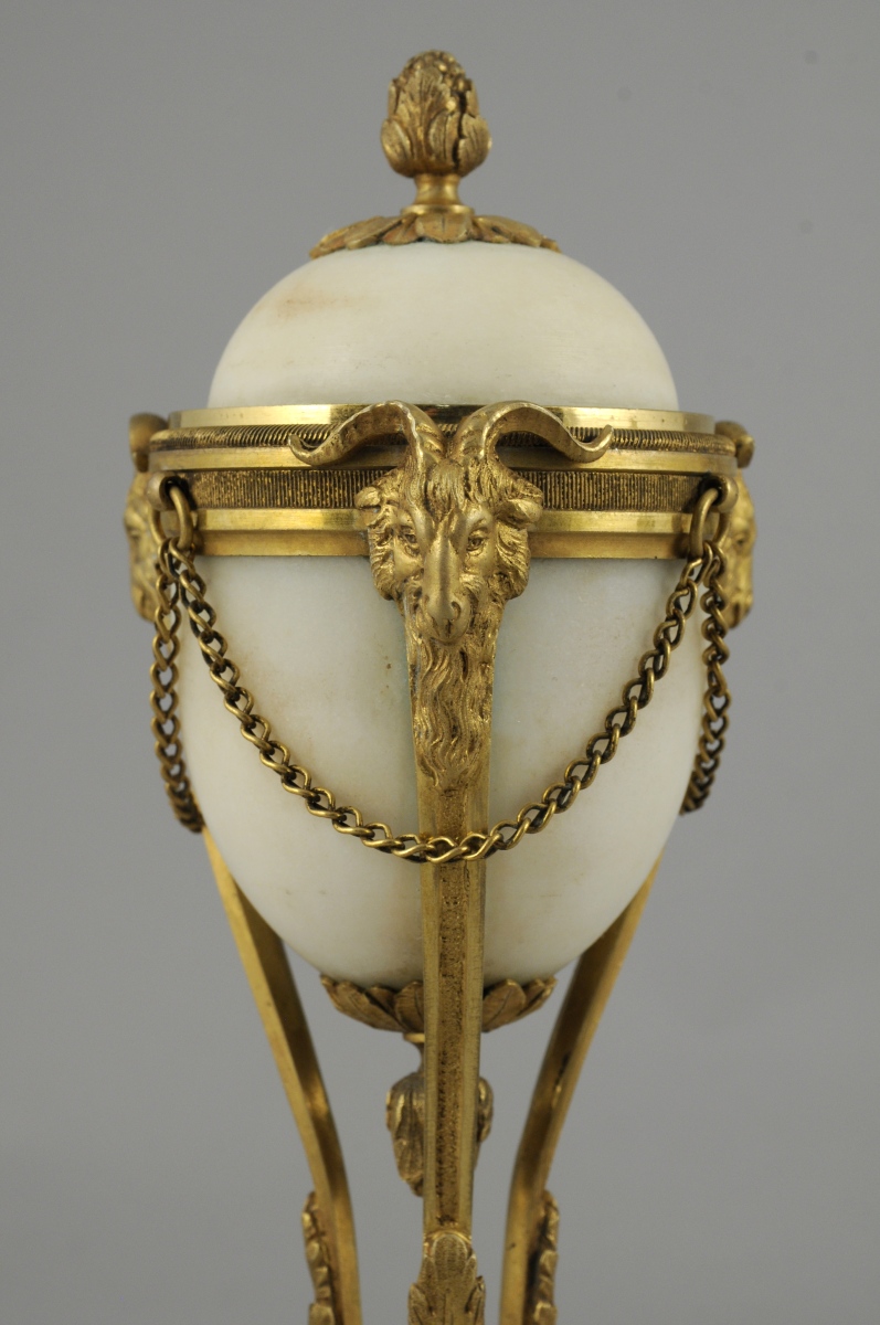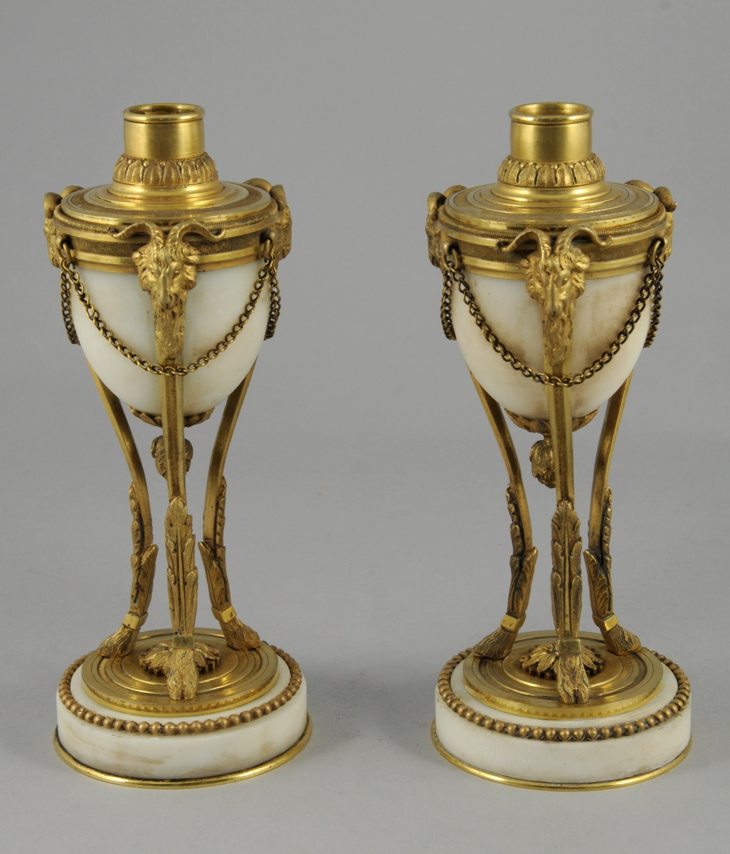Paire de CASSOLETTES FORMANT FLAMBEAUX de forme ovoïde en bronze ciselé doré et marbre blanc. Les couvercles surmontés d'une graine et de feuillages, les bobèches ornées d'une frise de feuilles d'eau. Elles reposent sur trois pieds surmontés de têtes de béliers et terminés par des sabots de capridés. Base circulaire en marbre agrémentée de rais de perle et d'une rosace.