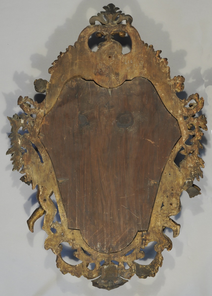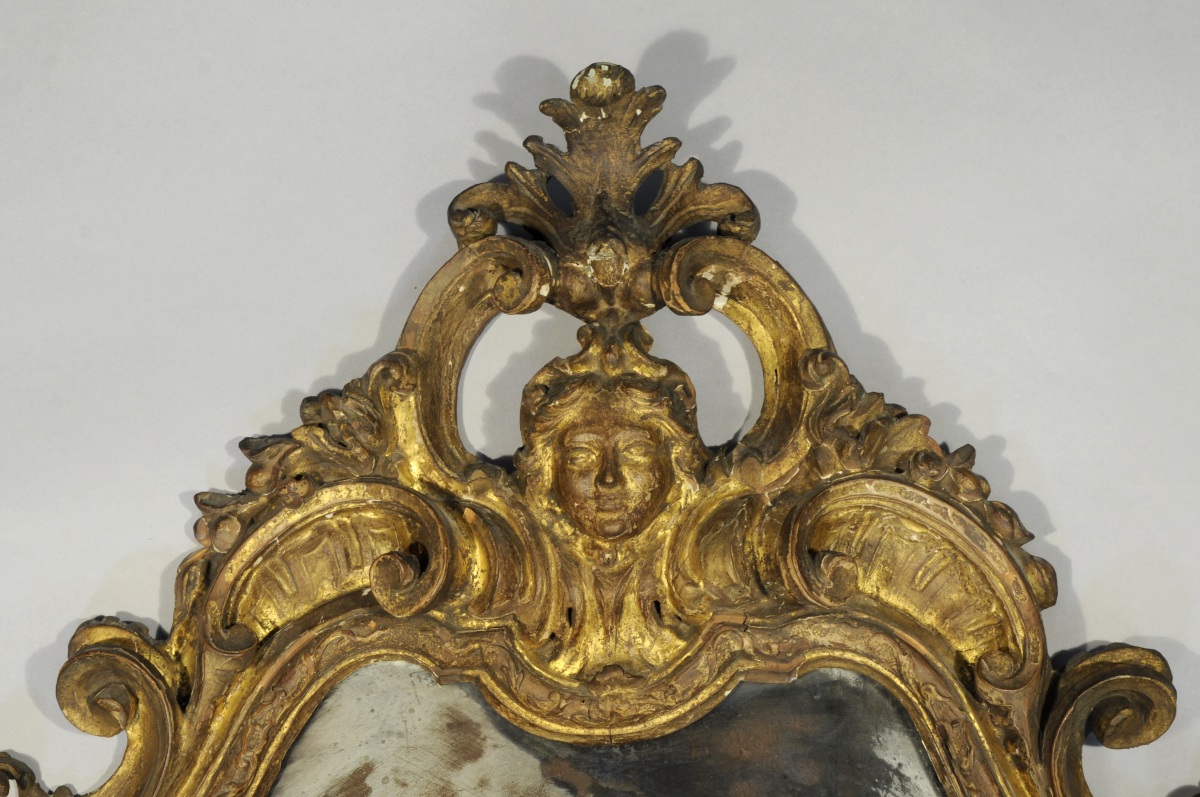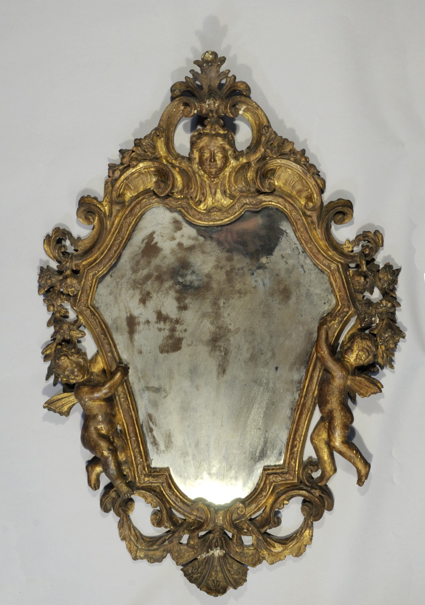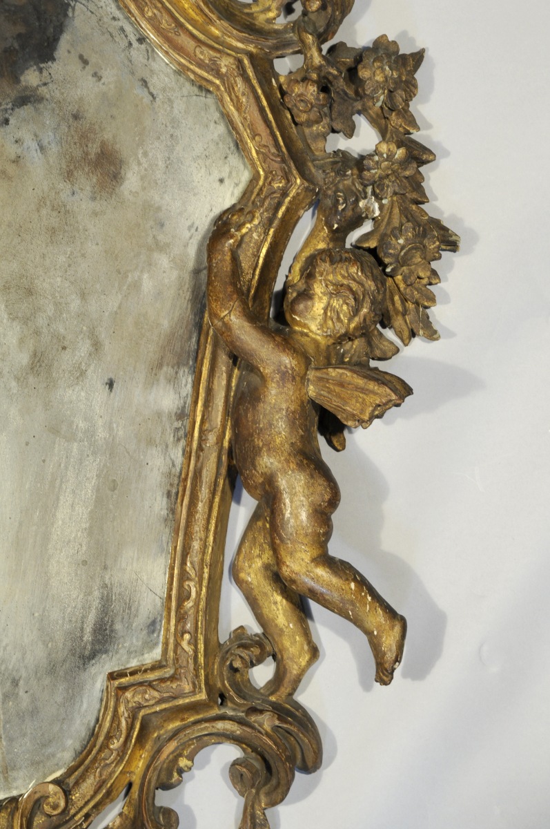 MIROIR AUX ANGELOTS dans un encadrement mouvementé en bois doré sculpté de deux angelots, coquilles, agrafes, feuilles d'acanthe et fleurettes. Le fronton est orné d'un visage de jeune femme.