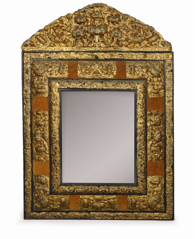 MIROIR à fronton richement orné d'applications en laiton repoussé à...