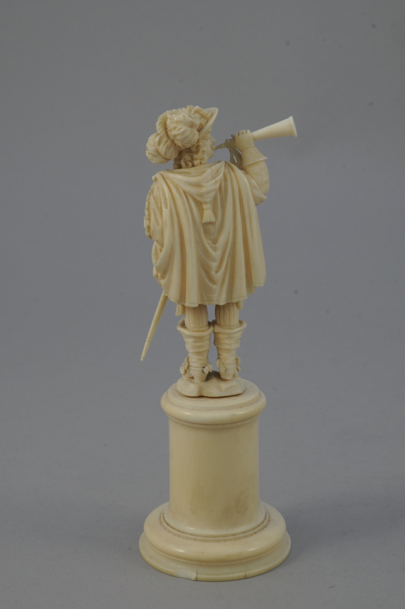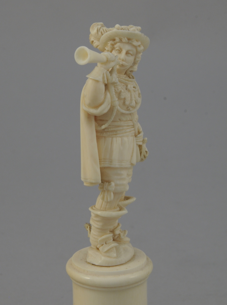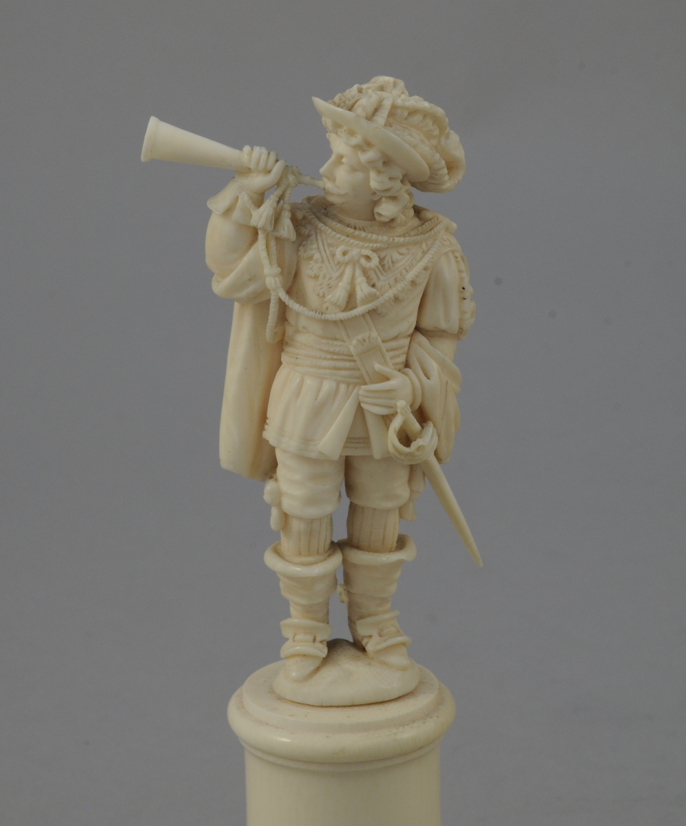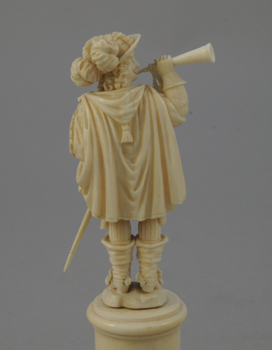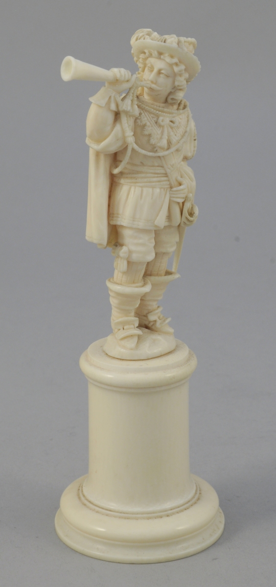 Ivoire sculpté en ronde-bosse figurant un homme d'armes élégamment vêtu et chaussé sonnant sur une colonne dorique en ivoire.