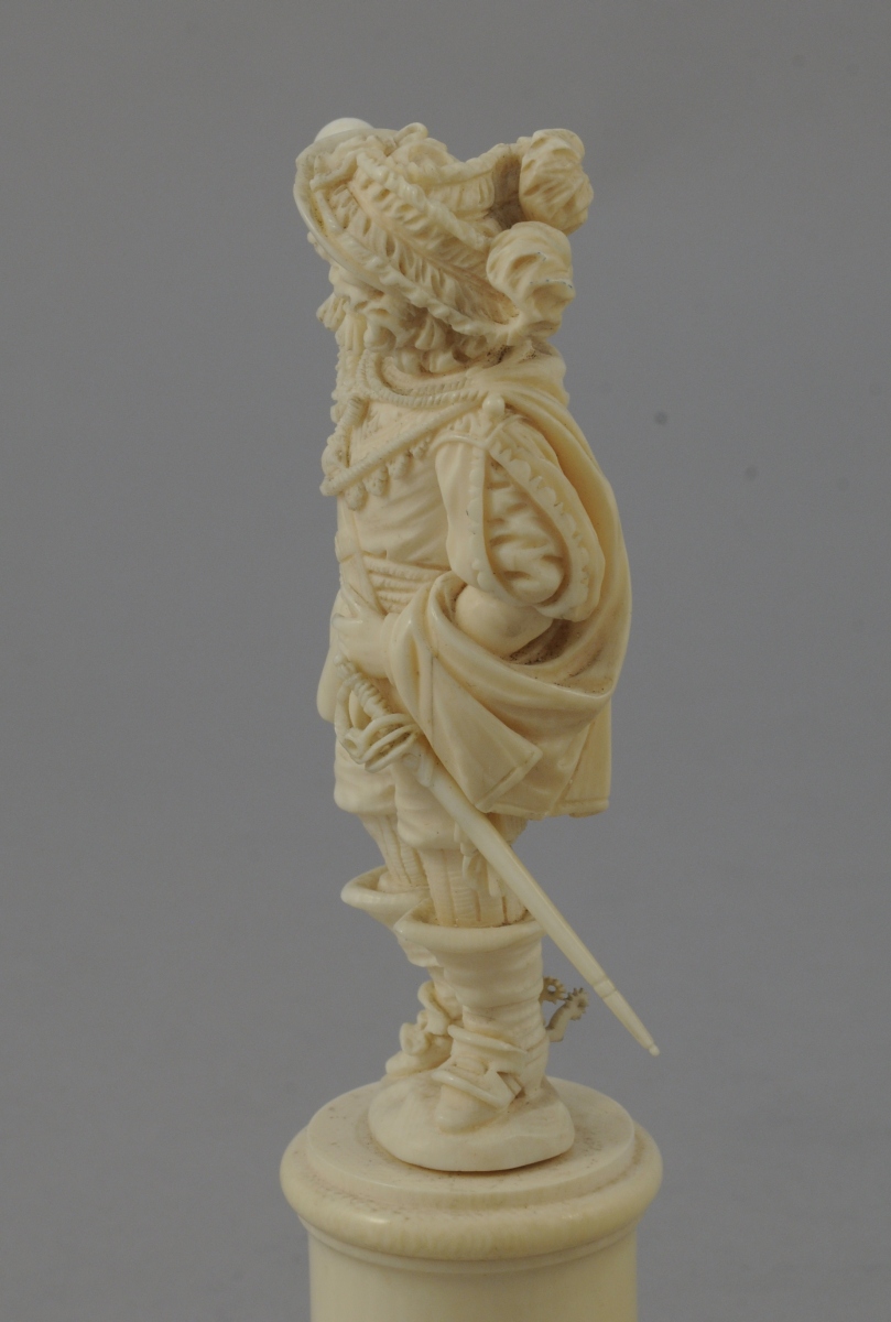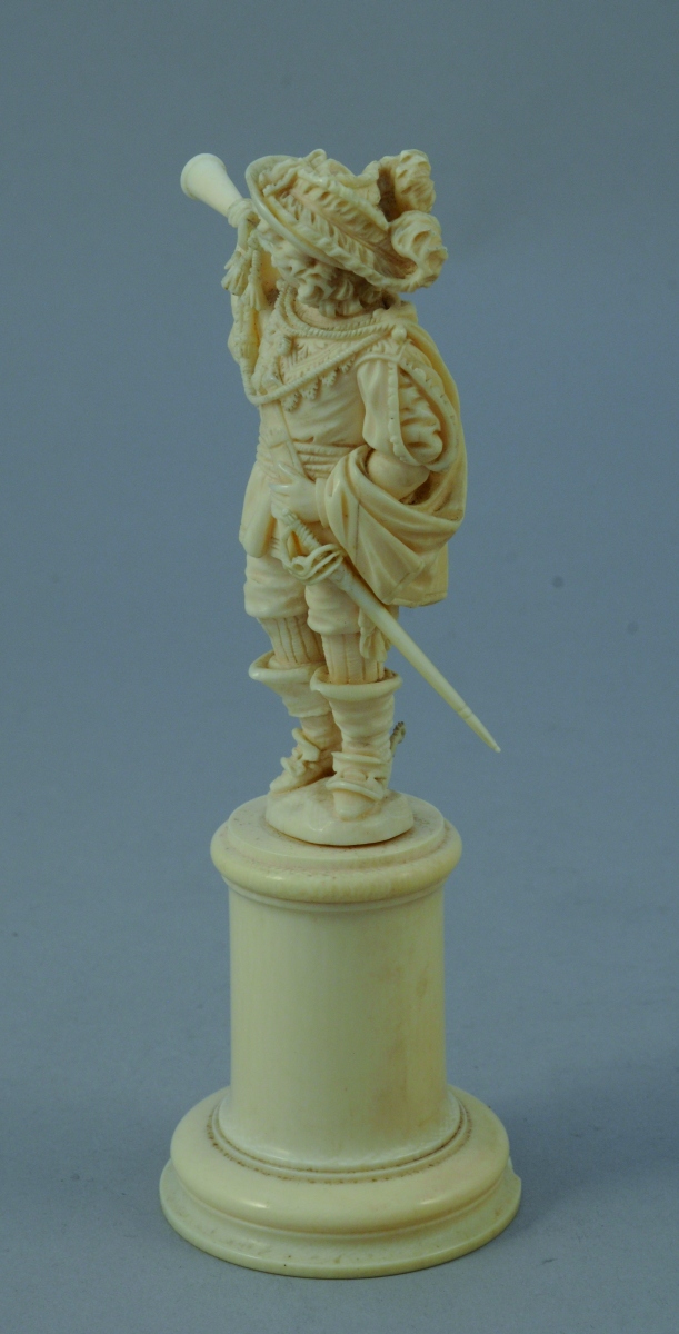 MOUSQUETAIRE SONNANTIvoire sculpté en ronde-bosse figurant un homme d'armes élégamment...
