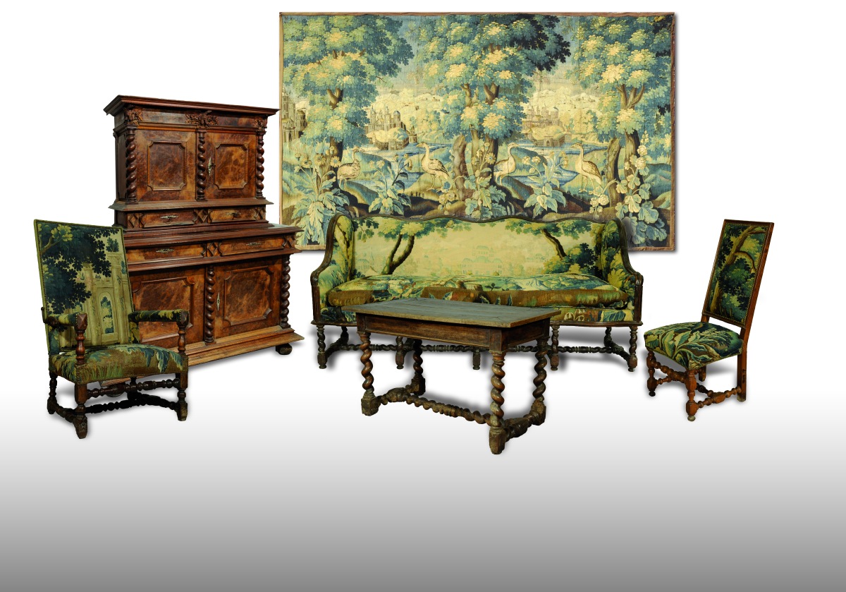Ce mobilier ancien, d'inspiration Louis XIII, garnissait les pièces de réception du château de Candé en Touraine lors du mariage d'Édouard VII et de Wallis Simpsons, les futurs Prince et Princesse de Galles le 3 juin 1937.